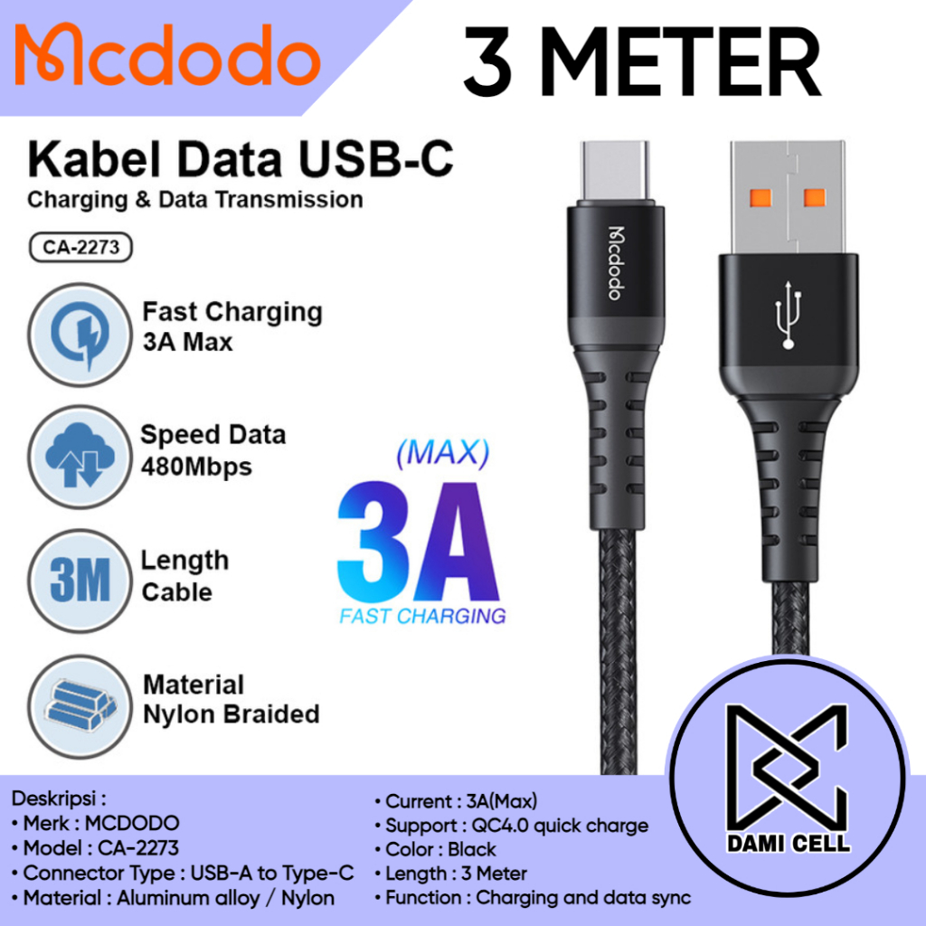 Kabel Data Type C 3 Meter Cable Charge Android Tepsi Fast Charging 3A ORIGINAL MCDODO CA-2273