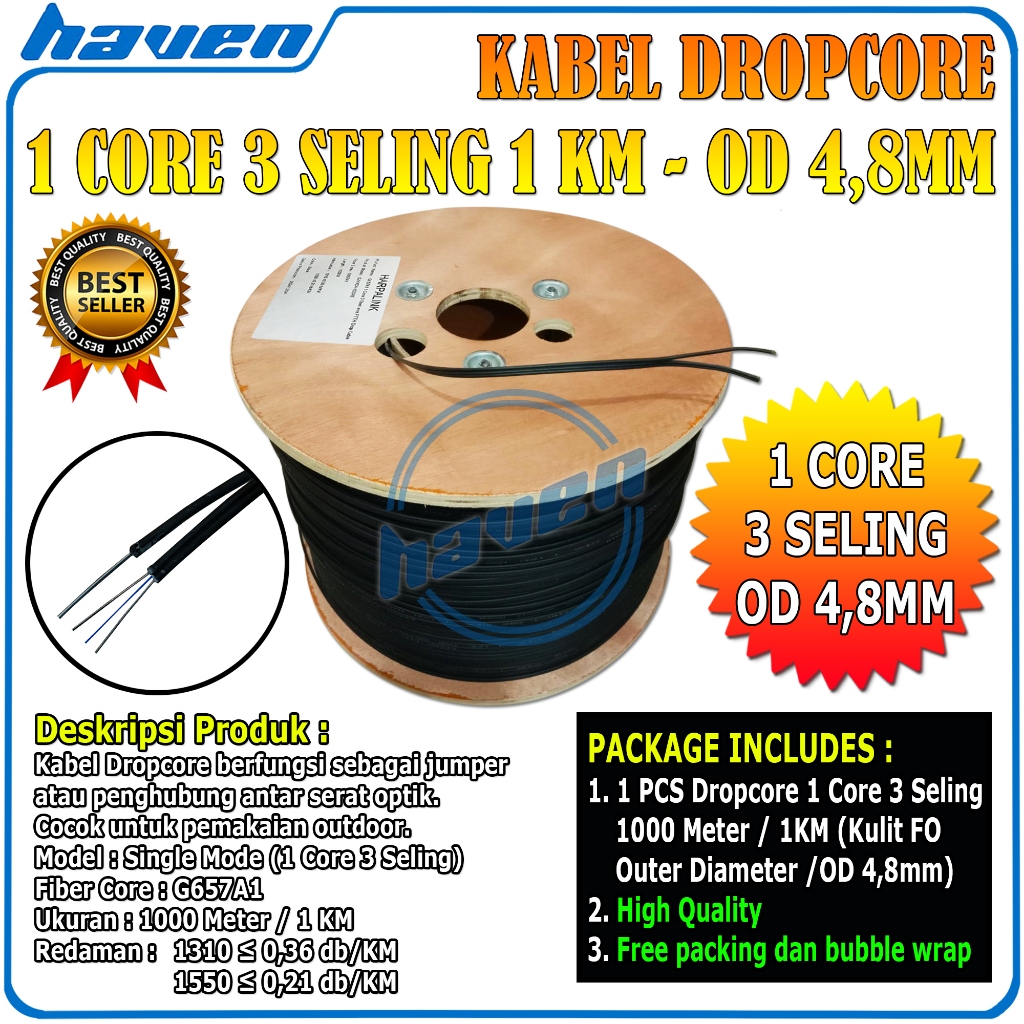 Kabel Fiber Optic Dropcore 1000M 1 Core 3 Seling Kabel Fiber Optik 1000m FTTH Drop Wire DW FO 1000 Meter 3 Sling 1KM Terbaru Termurah