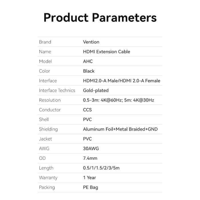 Kabel HDMI Extender Vention Perpanjangan HDMI Male to Female Black PVC - AHC