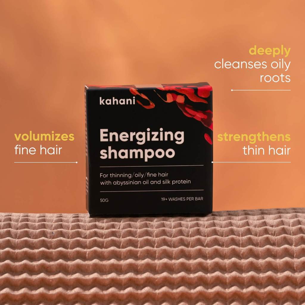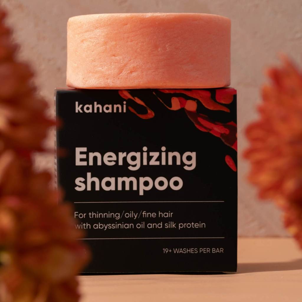 Kahani Energizing shampoo bar for fragile hair prone to falling out, lacking volume and strength. Sampo batang untuk rambut rontok, kurang bervolume dan lemah