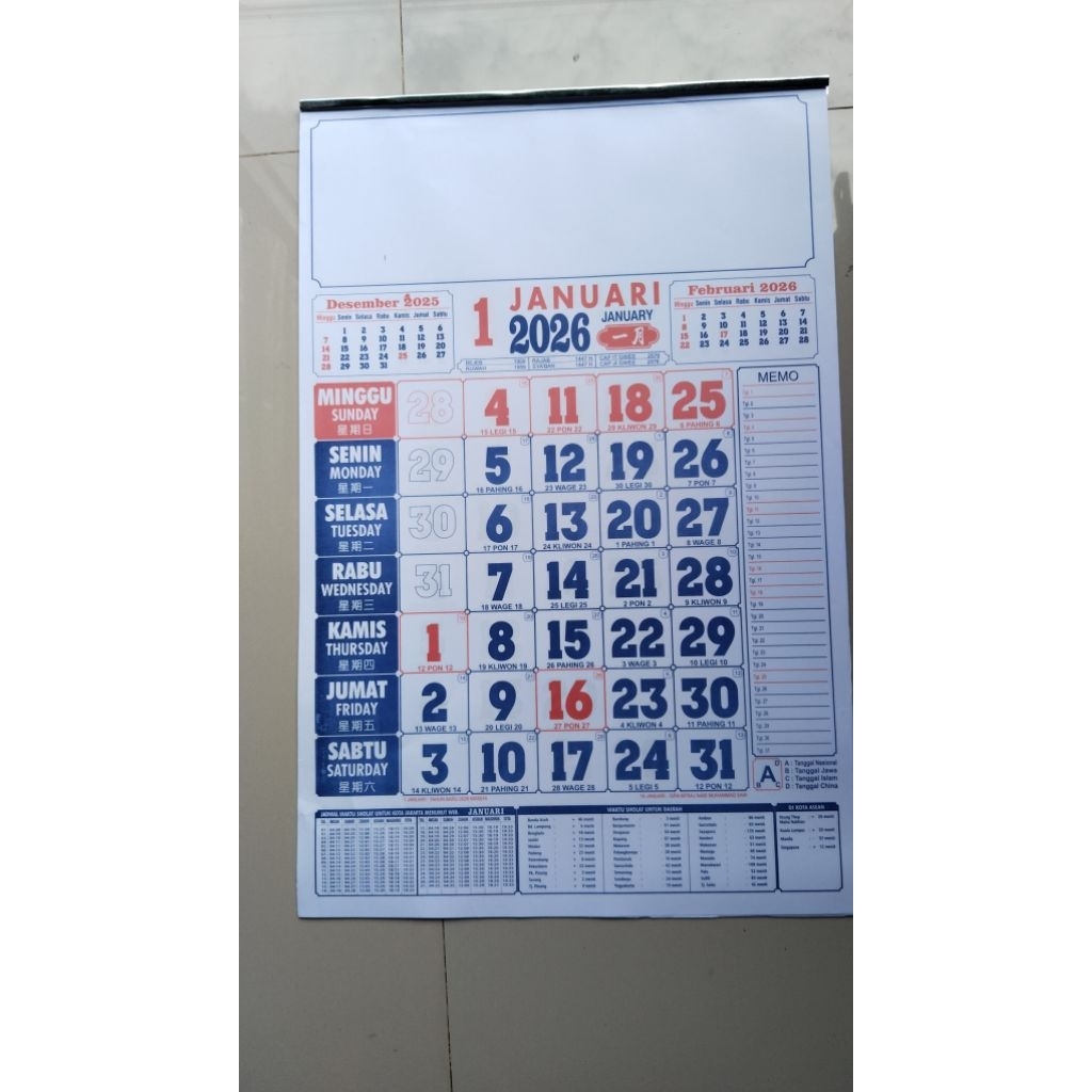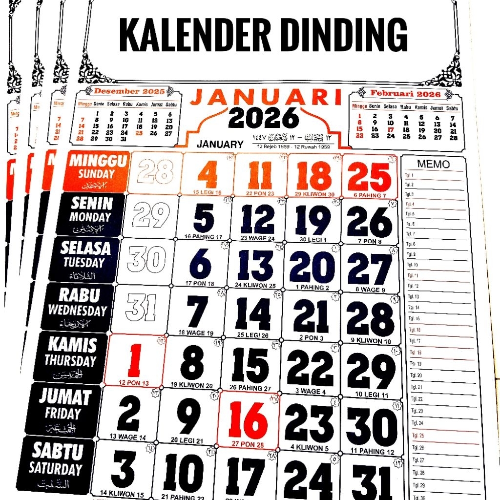 Kalender Dinding 2026 / Kalender / Kalender Bahasa ARAB/CINA Bulanan Pasaran Jawa 12 Lembar