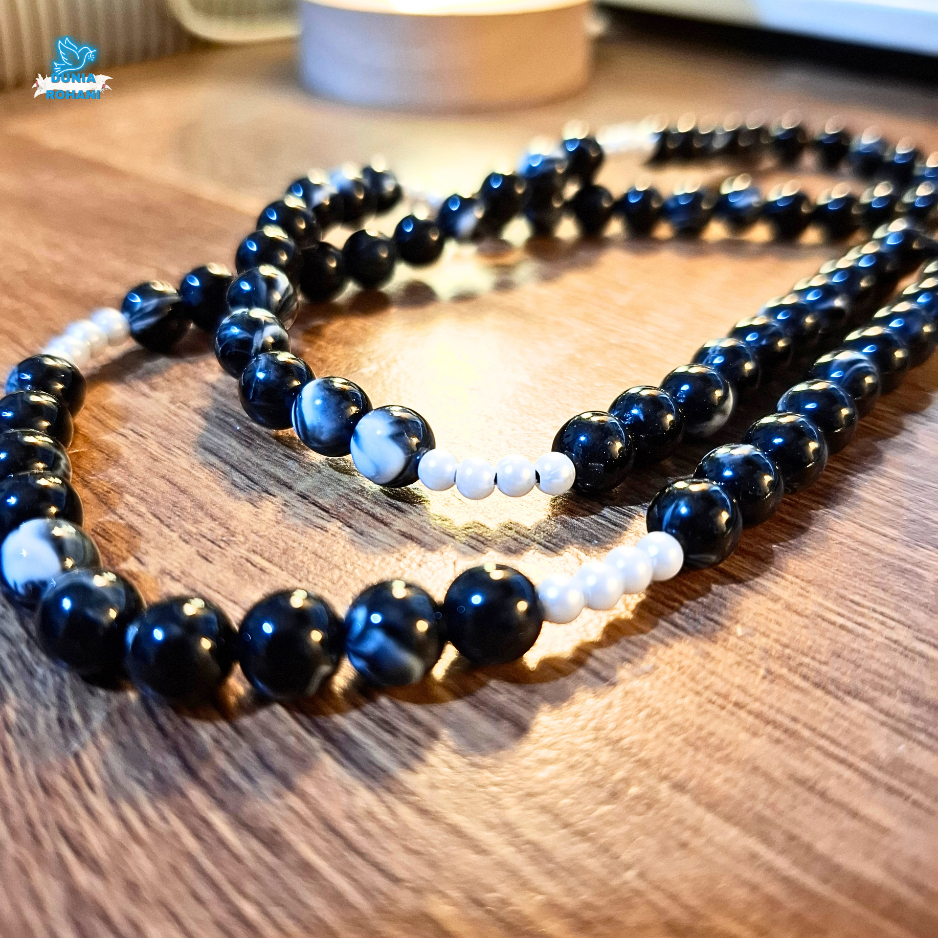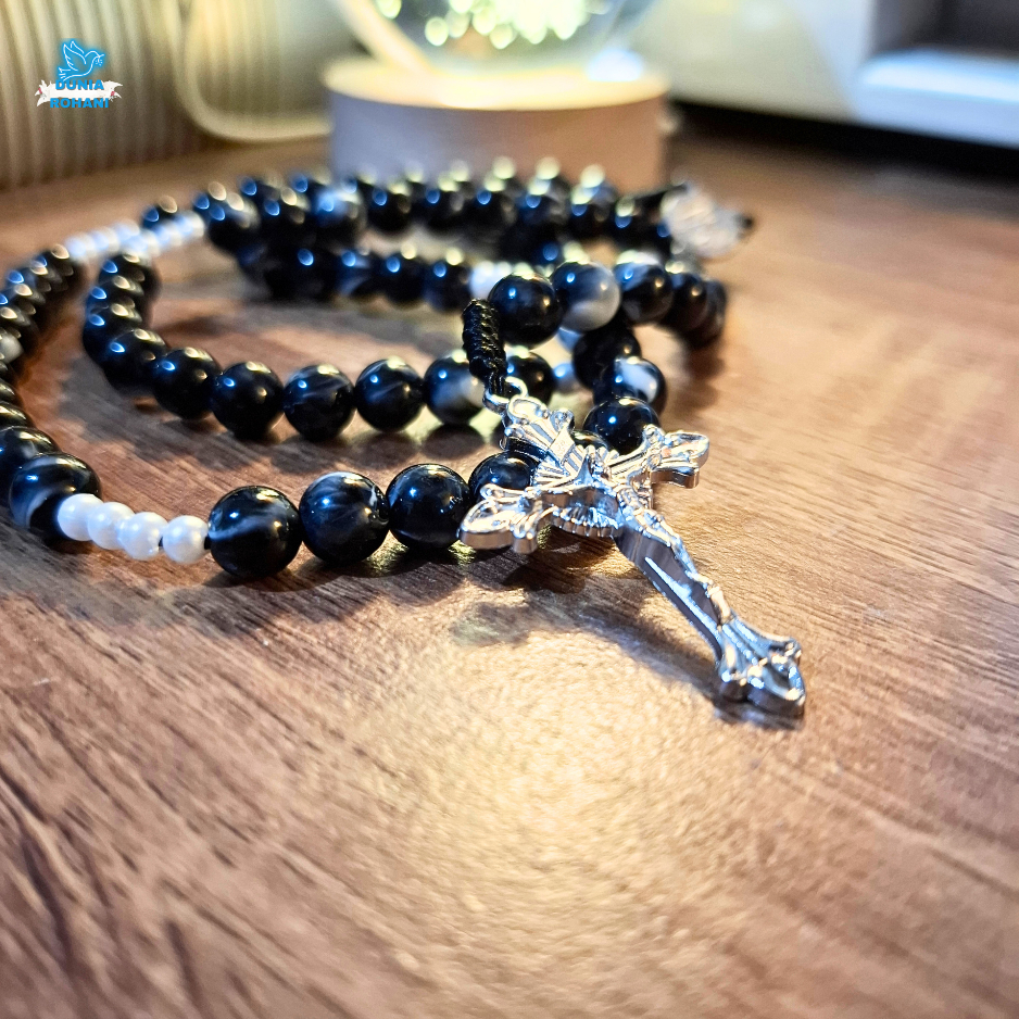 Kalung Rosario Marmer Hitam Bercorak 77 Bapa Kami - Tren Terbaru 2025 Manik Bercorak Eksklusif