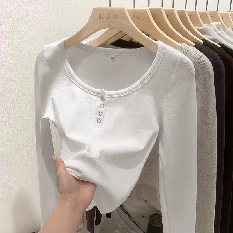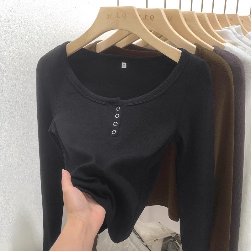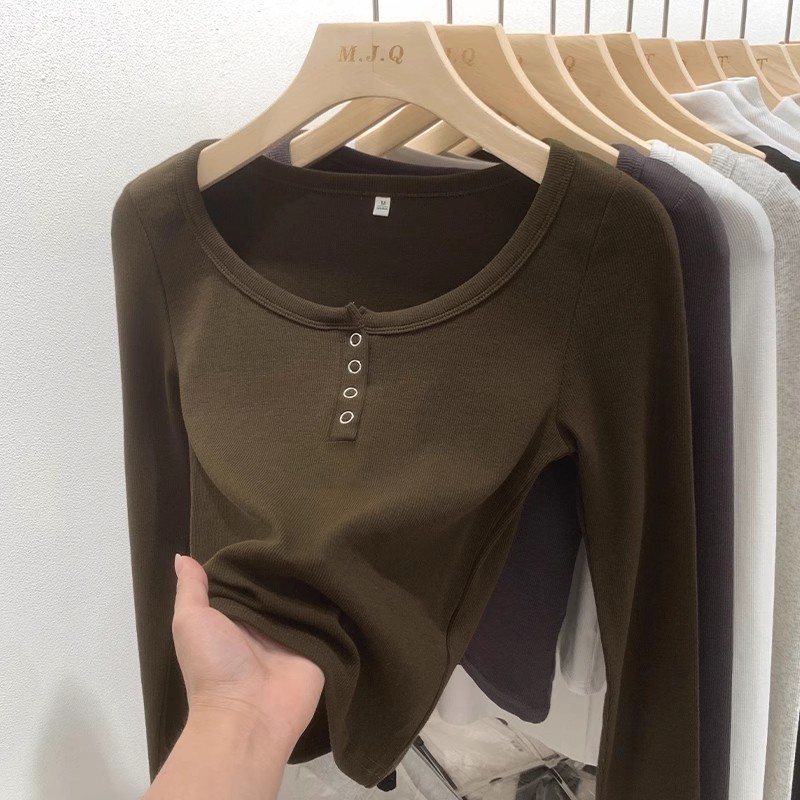 Kaos coklat lengan panjang leher bulat berkualitas tinggi/kaos berusuk lengan panjang