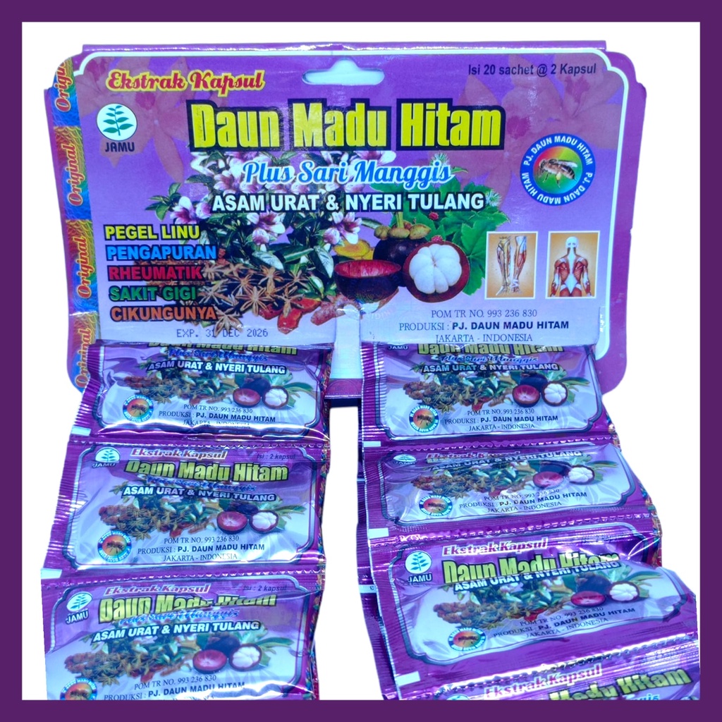 Kapsul Daun Madu Hitam Plus Sari Manggis, Jamu Asam Urat, Obat Nyeri Tulang, Obat Pegal Linu, Obat Herbal Pengapuran, Obat Rheumatik, Obat Sakit Gigi, Obat Chikungunya, Obat Kesemutan, Obat Encok, Jamu Tradisional.