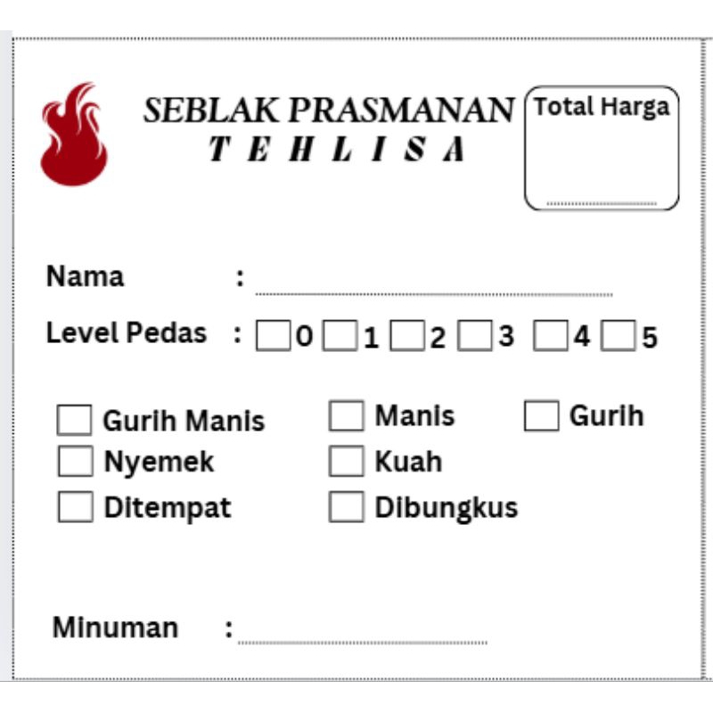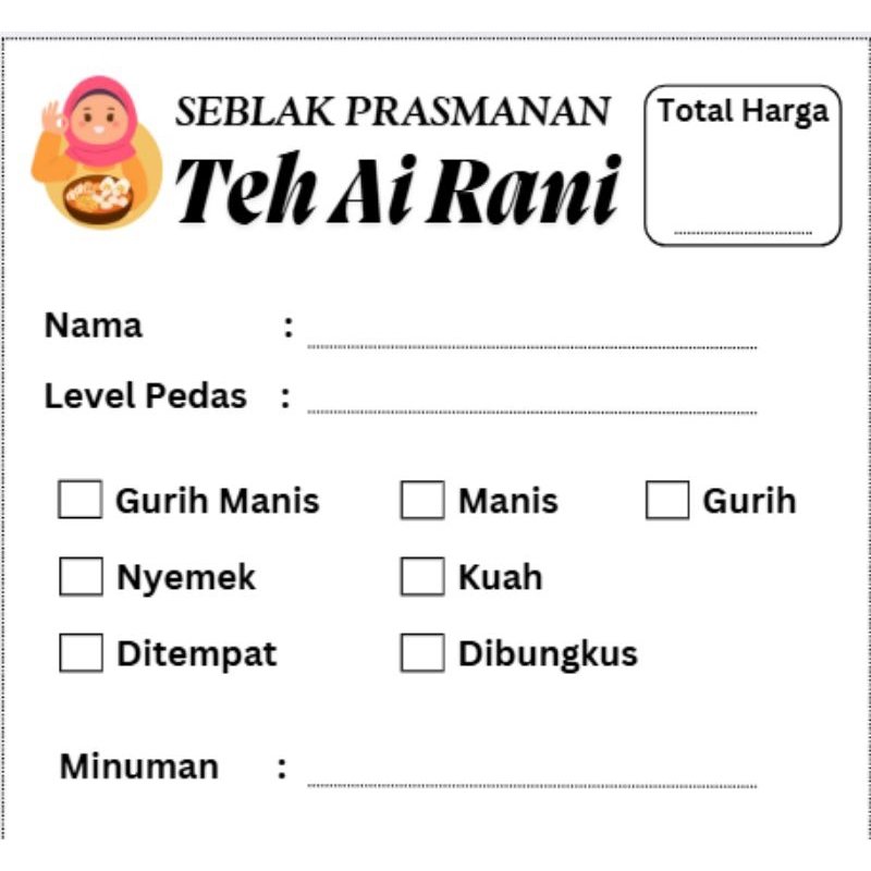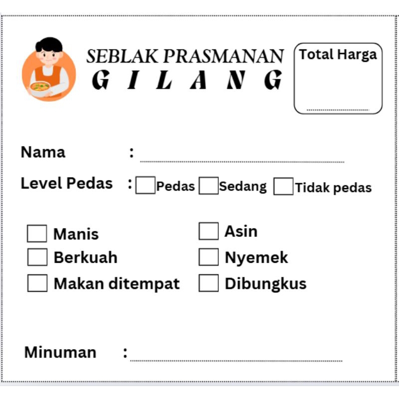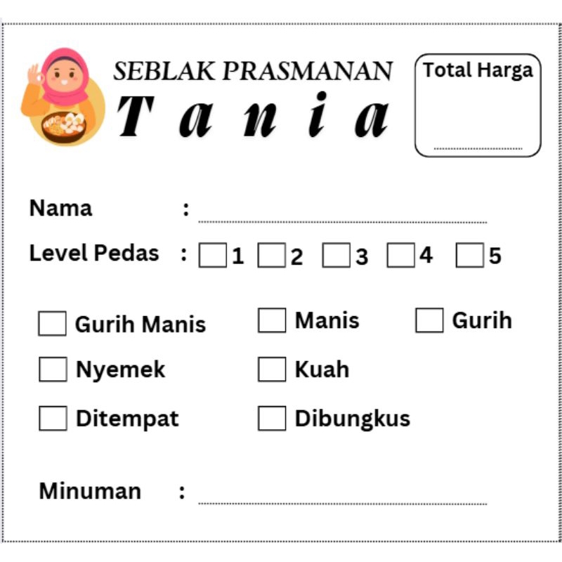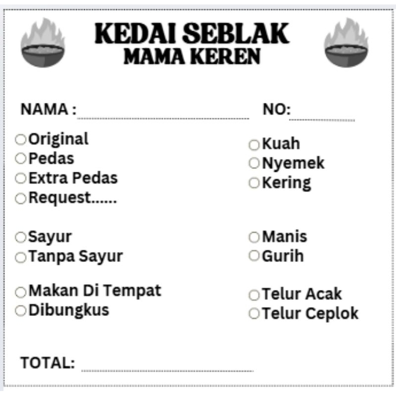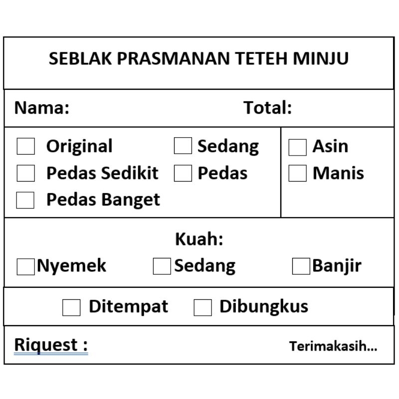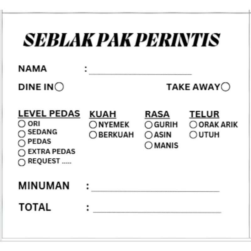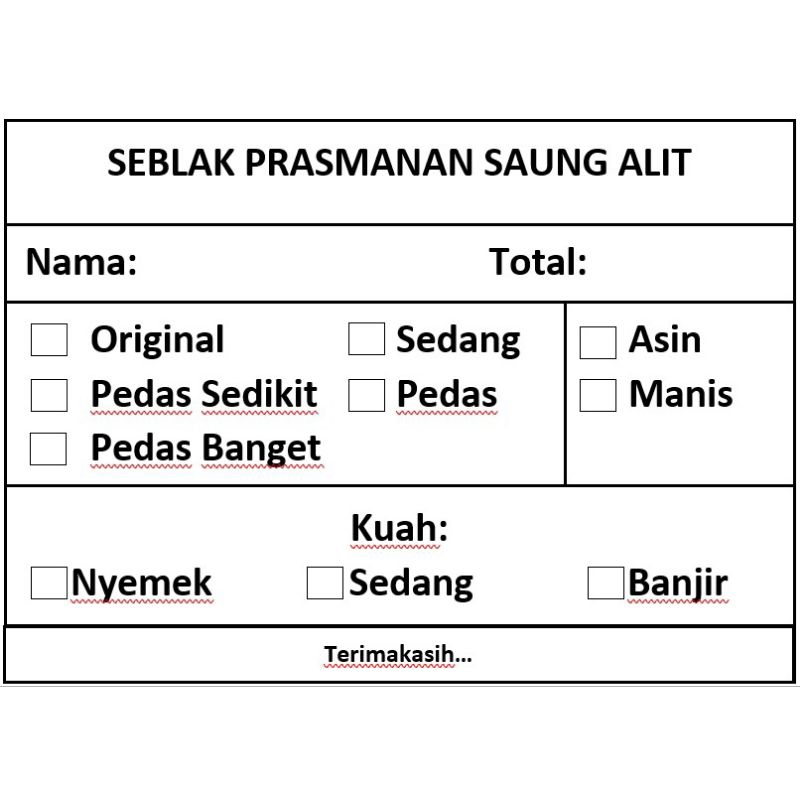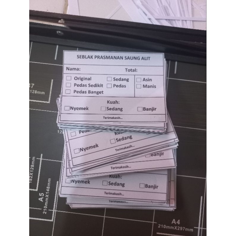 Kartu pesanana seblak/kertas orderan seblak