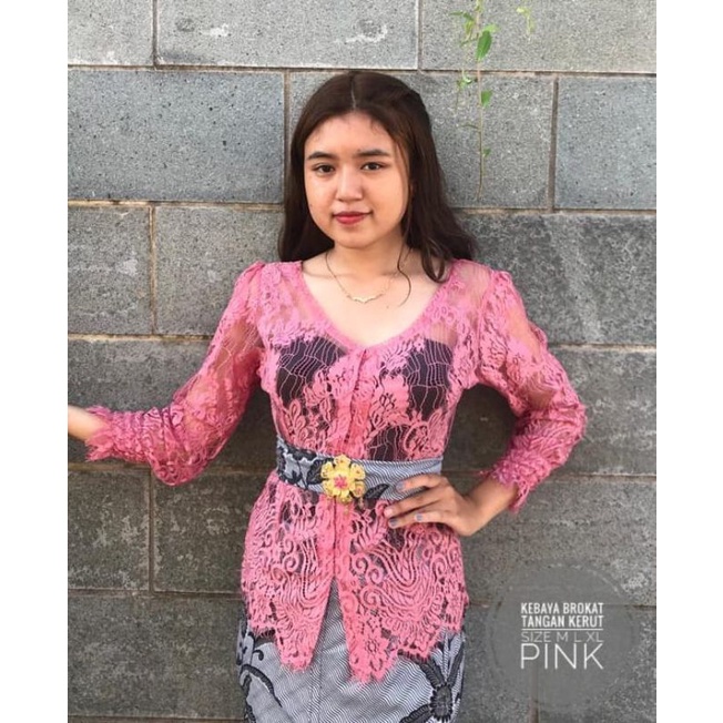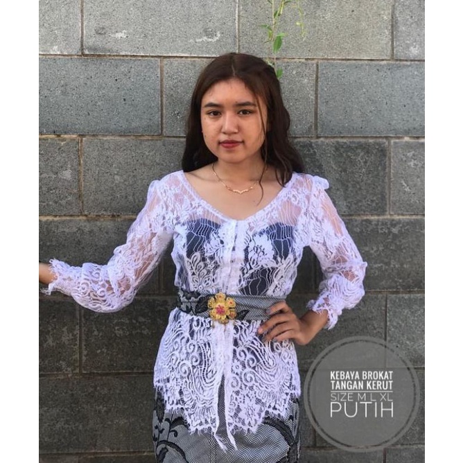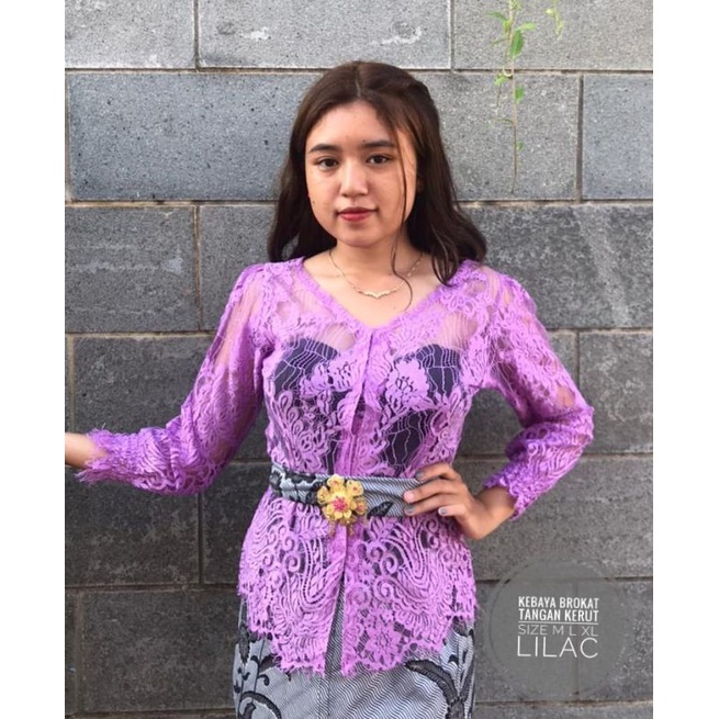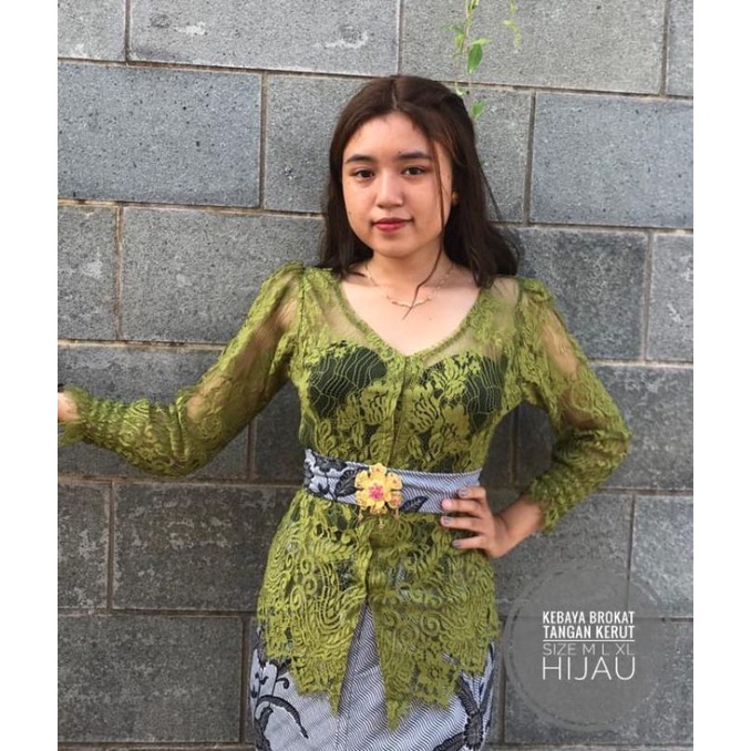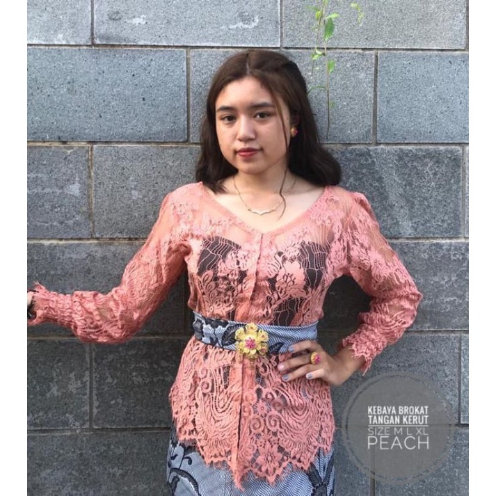 Kebaya Brokat Model Leher V Tangan Kerut
