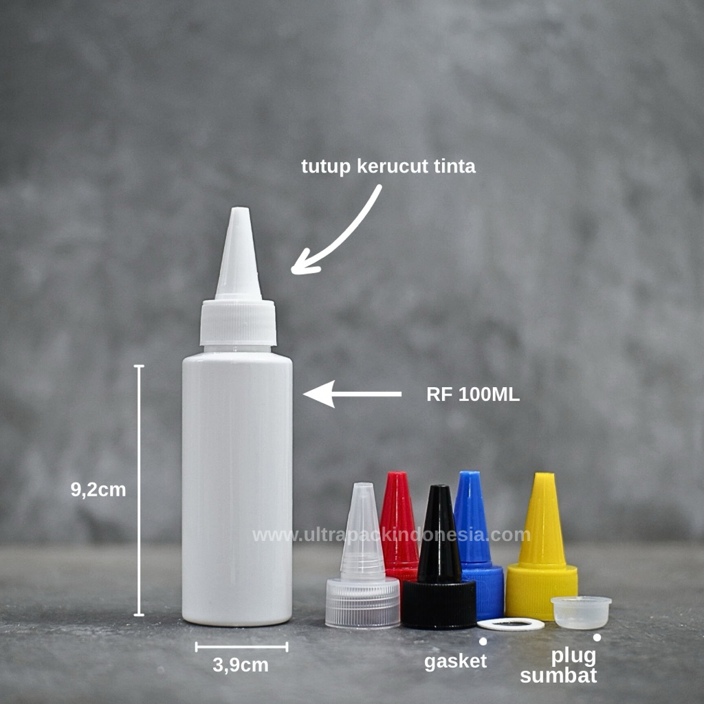 KEMASAN BOTOL TINTA ANTI BOCOR - BOTOL PET RF 100ML PUTIH + TUTUP TINTA + PLUG DALAM ANTI BOCOR