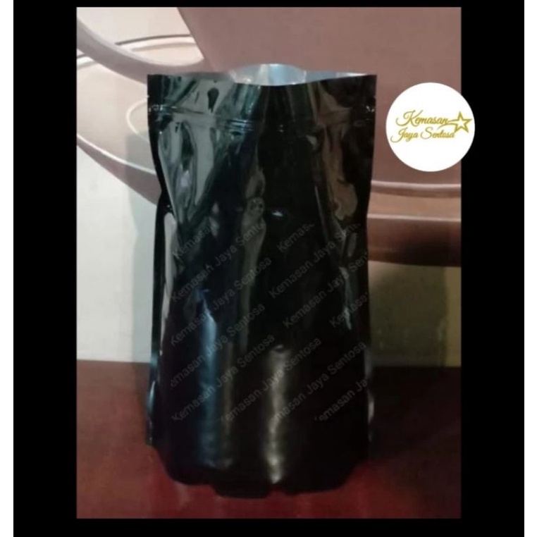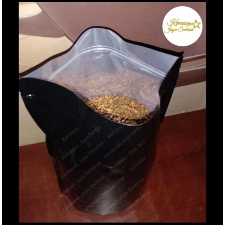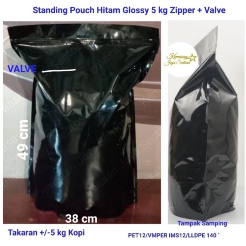 Kemasan Kopi Standing pouch hitam glossy 5 kg zipper + valve.kemasan kopi.flat bottom hitam.standing pouch hitam.kemasan kopi 5 kg