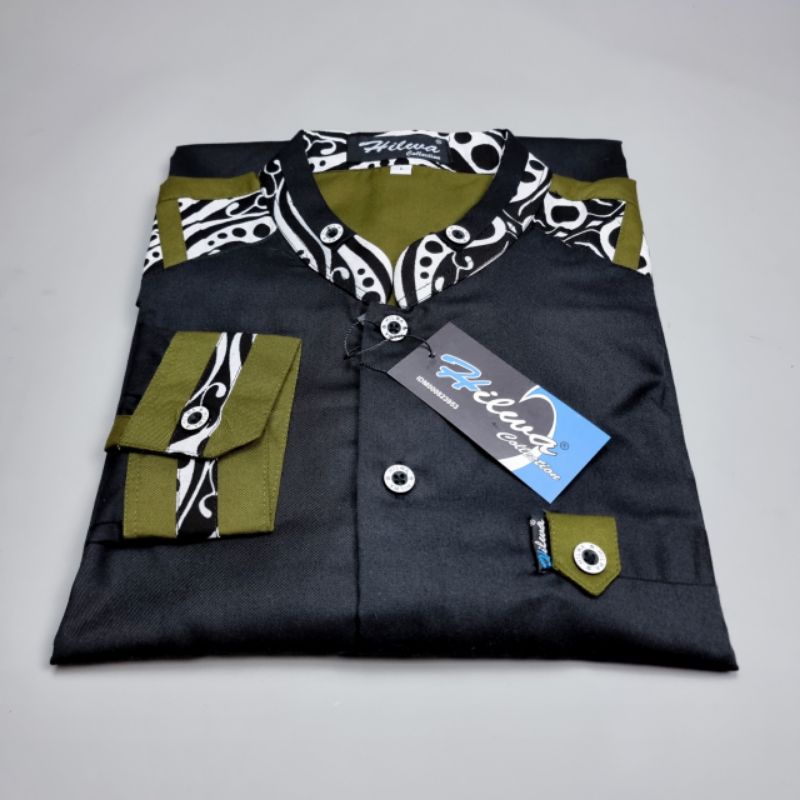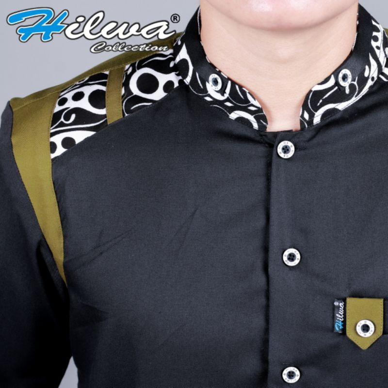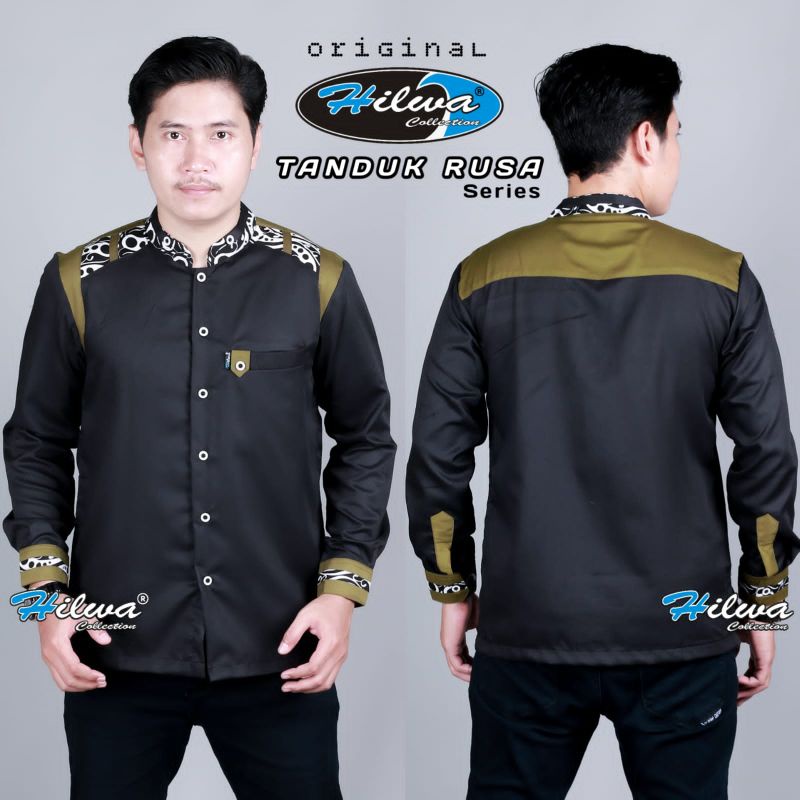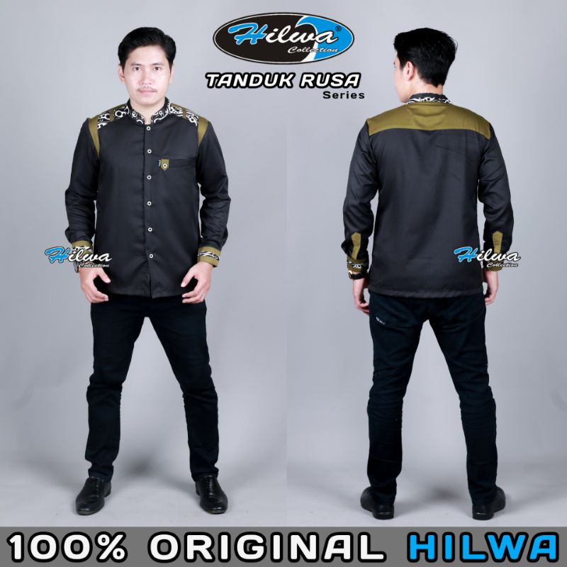 Kemeja Baju Koko Fashion Muslim Seragam Hadroh Pria Dewasa Lengan Panjang HILWA Motif Tanduk Rusa Warna Hitam Matt Katun Toyobo