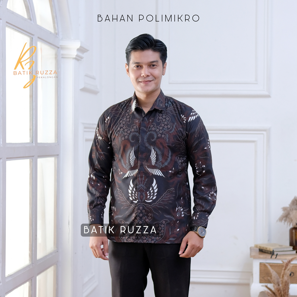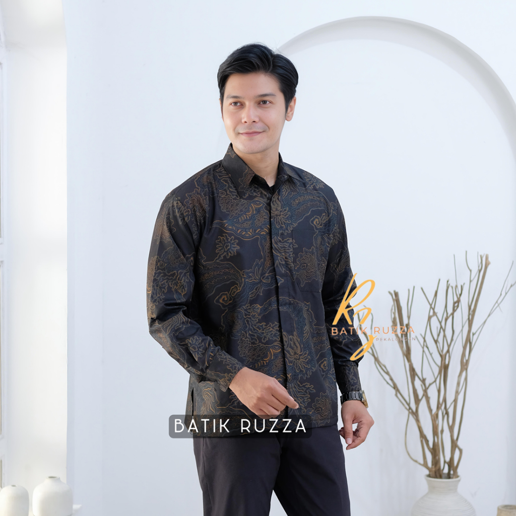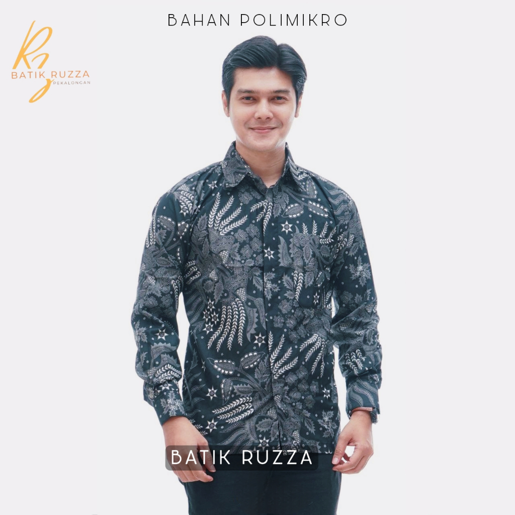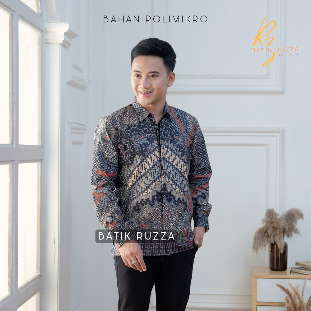 Kemeja Batik Pria Lengan Panjang Batik Ruzza Motif Sentani Hitam Sage Abu Dewasa