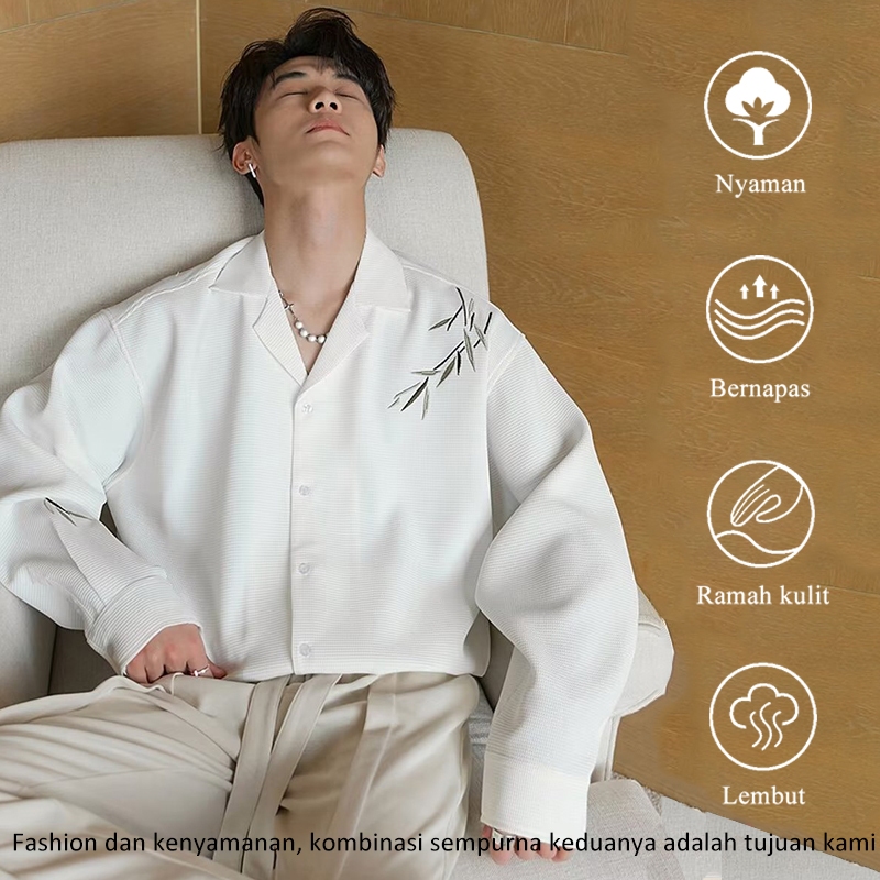 Kemeja Pria hitam Lengan Panjang baju kemeja cowok V Neck kantor original formal kasual Desain bordir daun bambu korean style Kemeja Pria putih baju