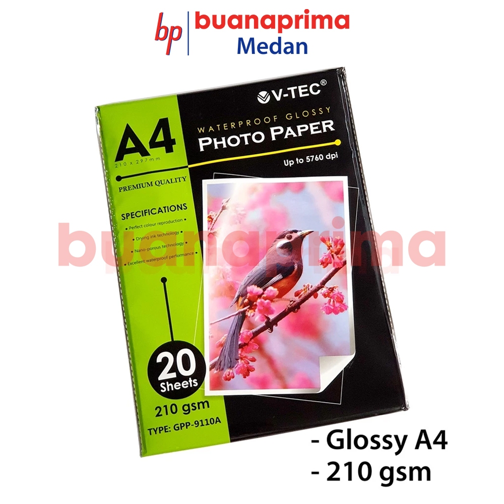 Kertas FOTO GLOSSY V-TEC A4 210 gsm 1 Pack isi 20 Lembar Photo Paper Kilat Vtec