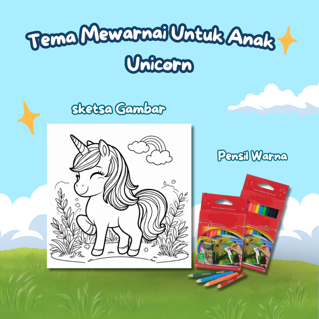 Kertas Gambar Mewarnai Untuk Anak Tk & Paud Tema : Unicorn Isi 20 Lembar Mewarnai + Pensil Warna