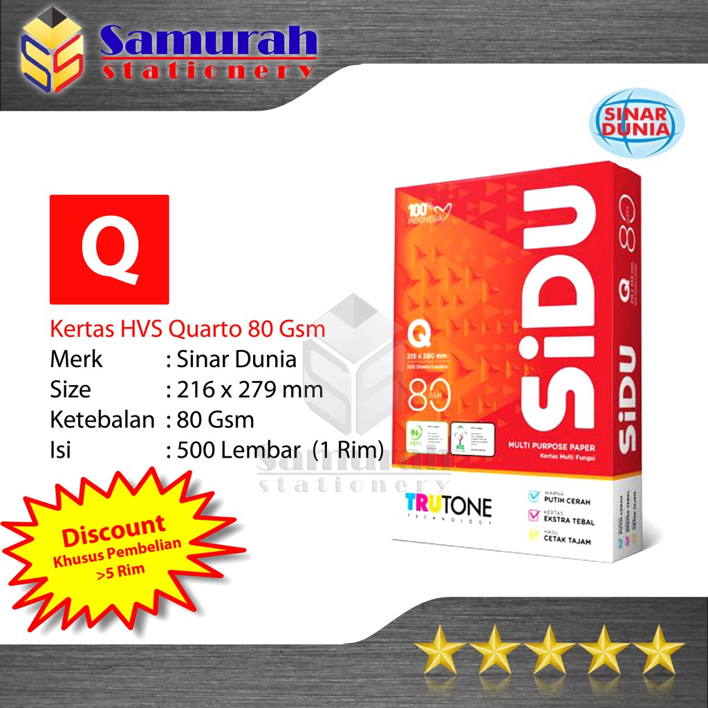 Kertas HVS Sinar Dunia Quarto 80 Gsm / HVS Sidu Q 80 Gram / Kertas HVS Putih Sidu Q80 gsm / 80Gsm