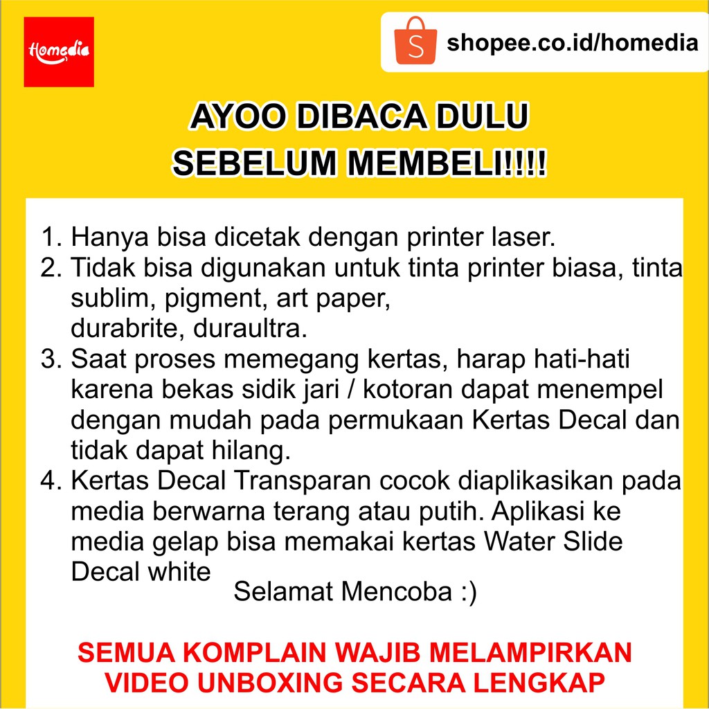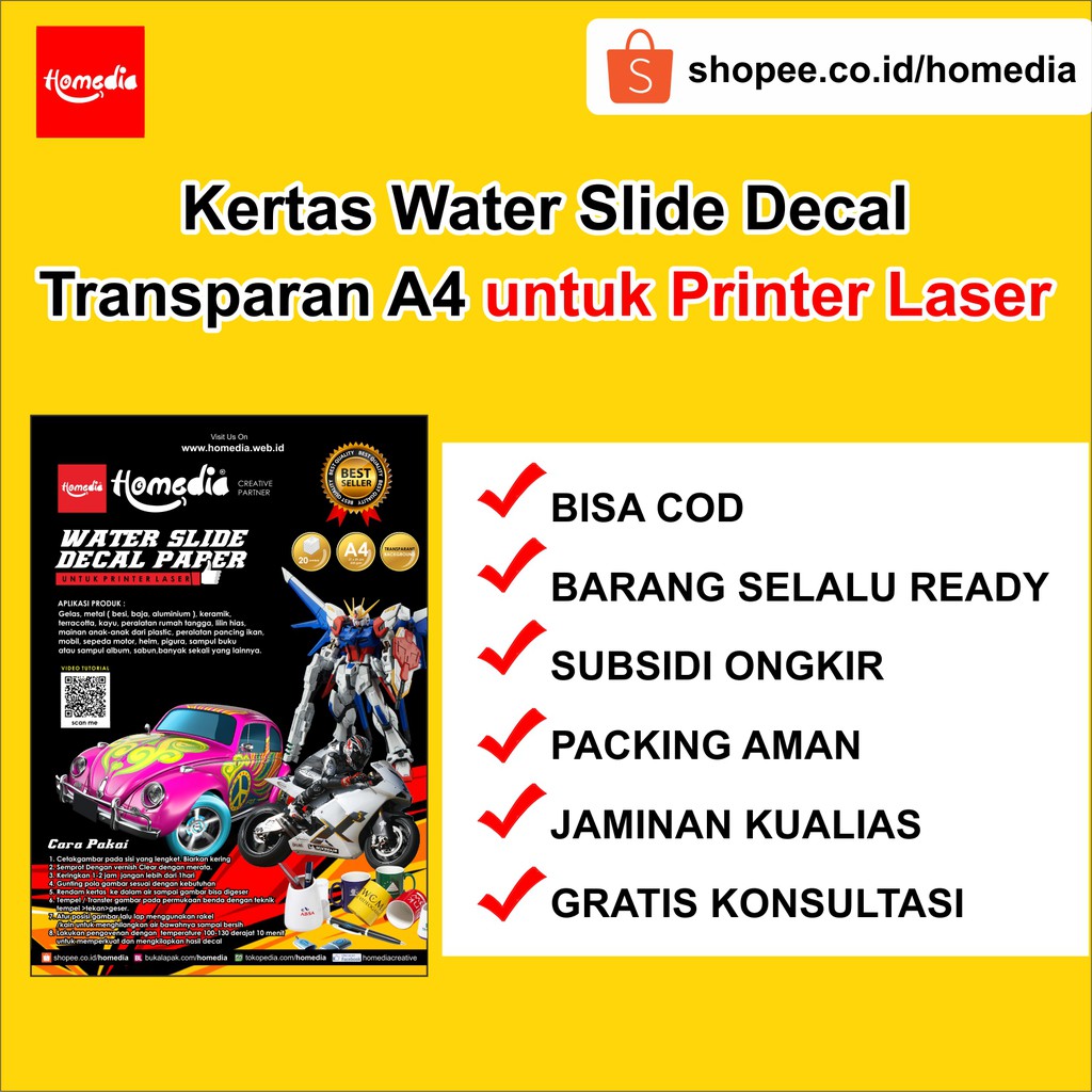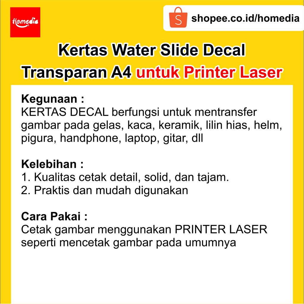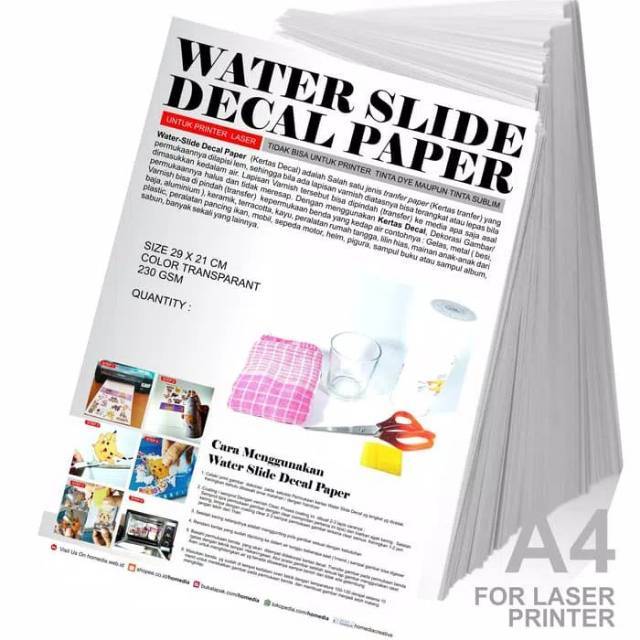 Kertas Water Slide Decal Transparan Ukuran A4 untuk PRINTER LASER Homedia