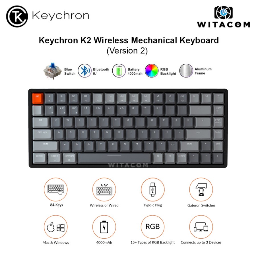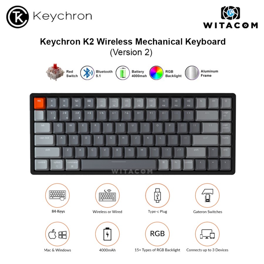 Keychron K2 84 Key Wireless Keyboard RGB Aluminum Frame Gateron