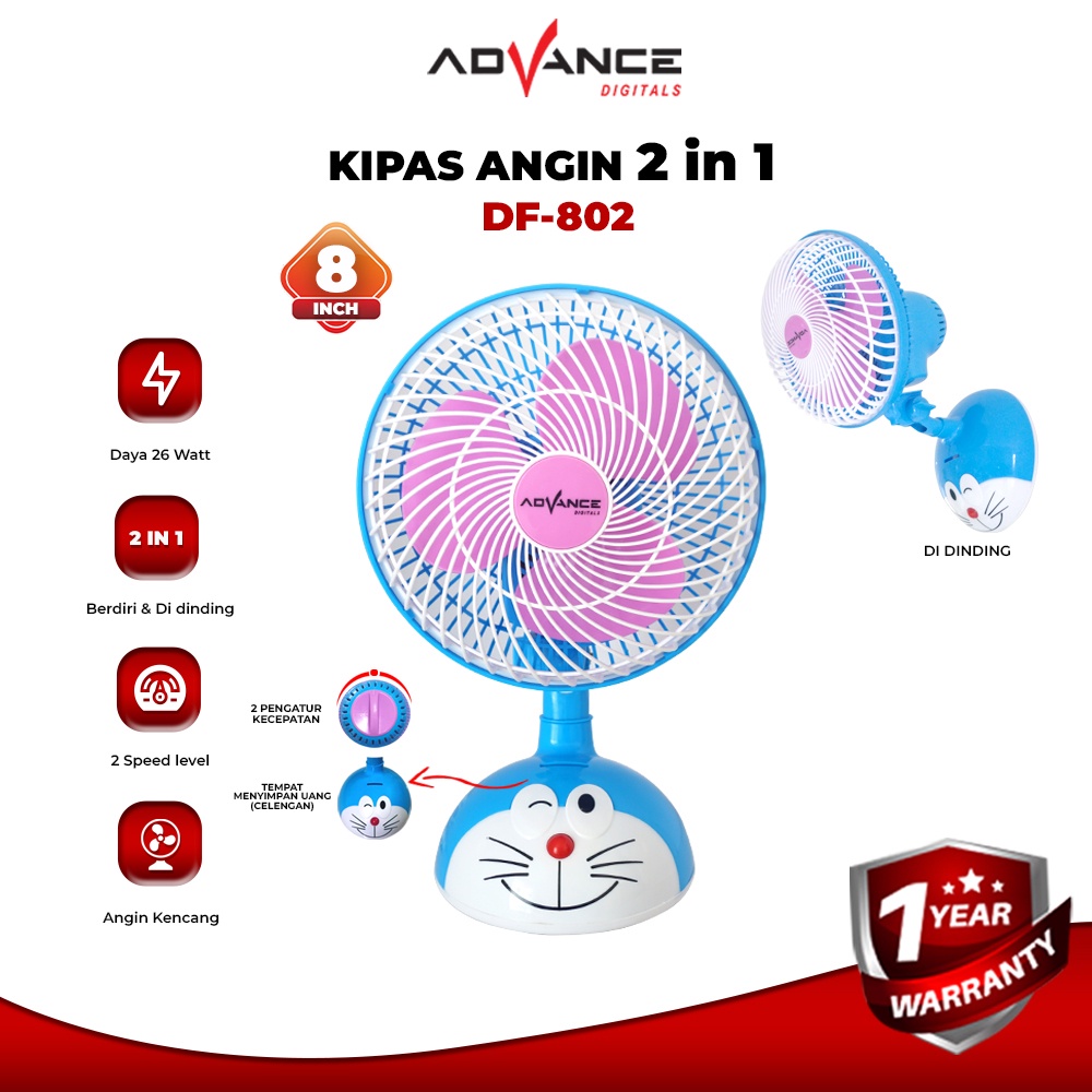Kipas Angin 8" Karakter Advance DF-802 2in1 Kipas Dinding Kipas Meja Doraemon