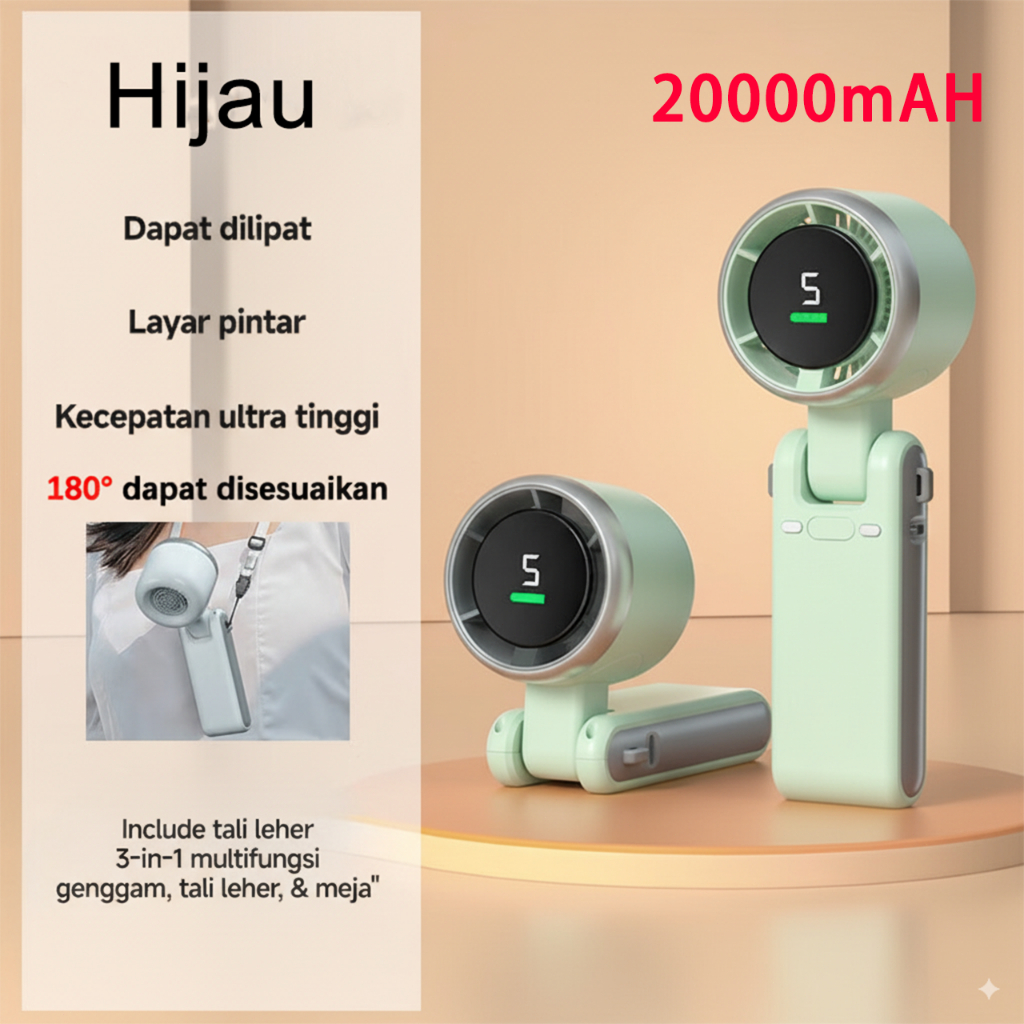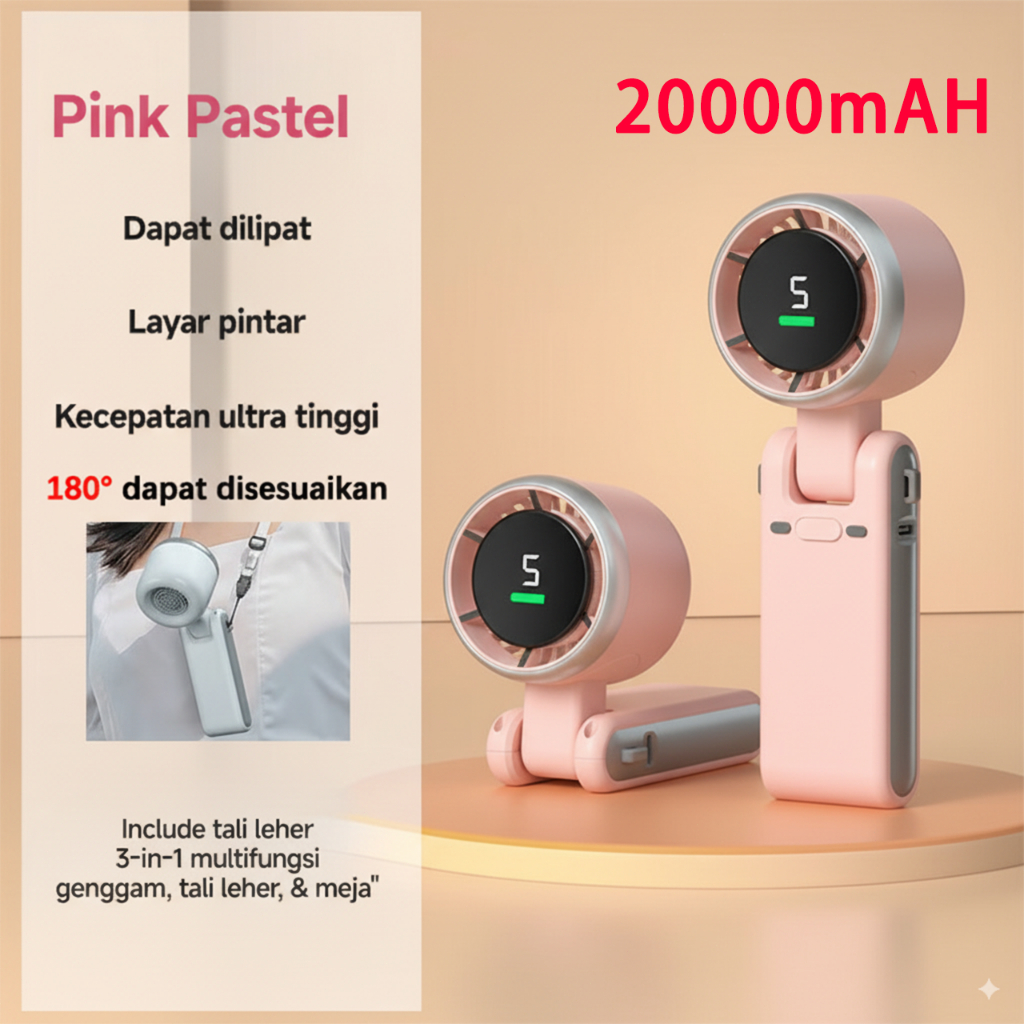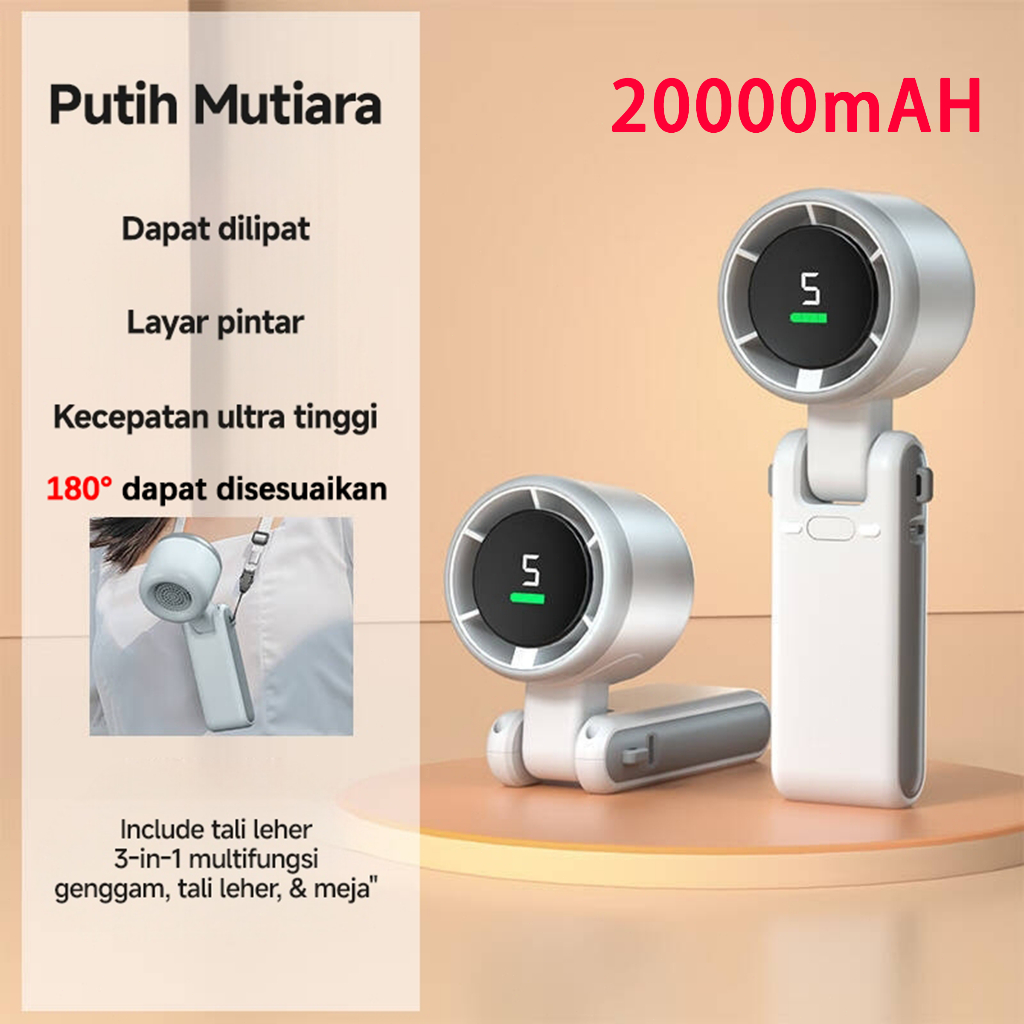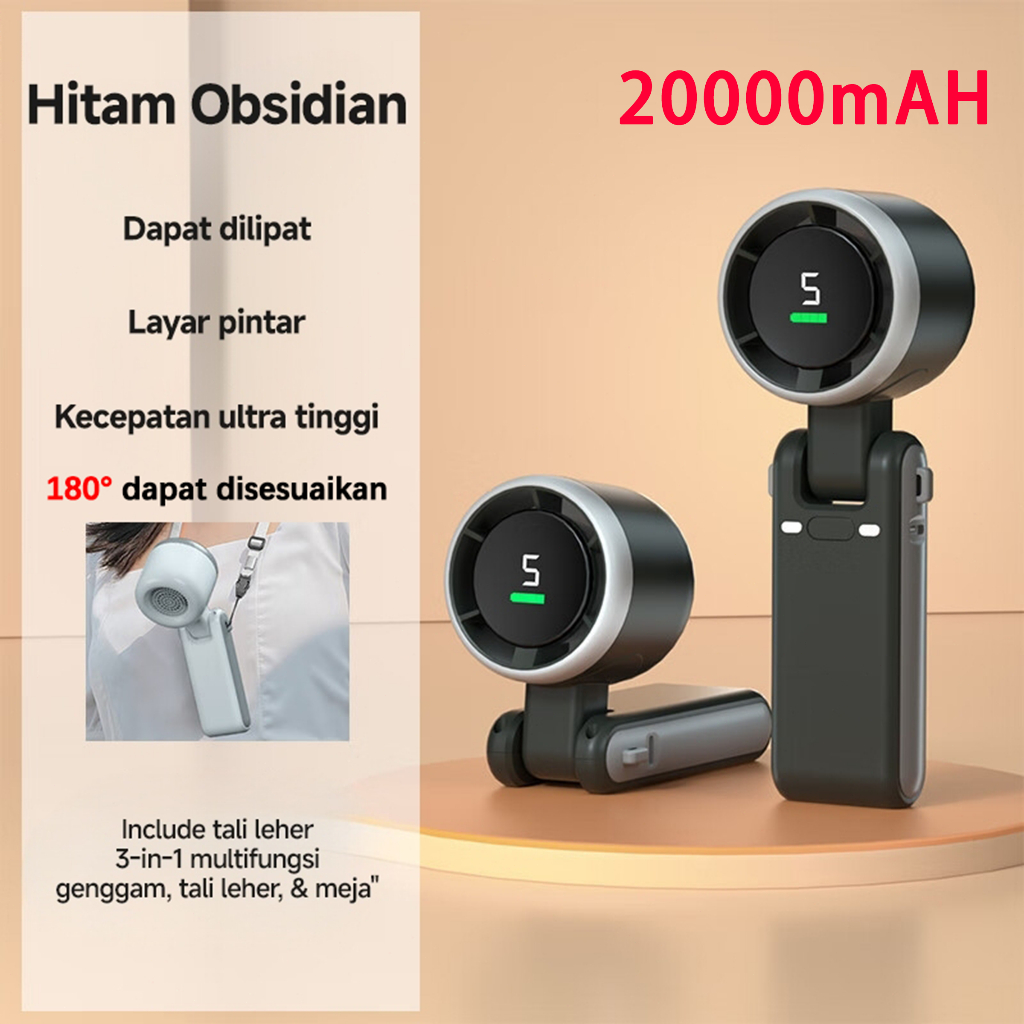 Kipas Lipat Portabel Berkecepatan Tinggi 180° Adjustable - Desain Digital Lipat, Angin Super Kencang & Ultra Senyap untuk Kantor/Outdoor, Daya Tahan 24 Jam, Type-c Charging, Bisa Digantung di Leher