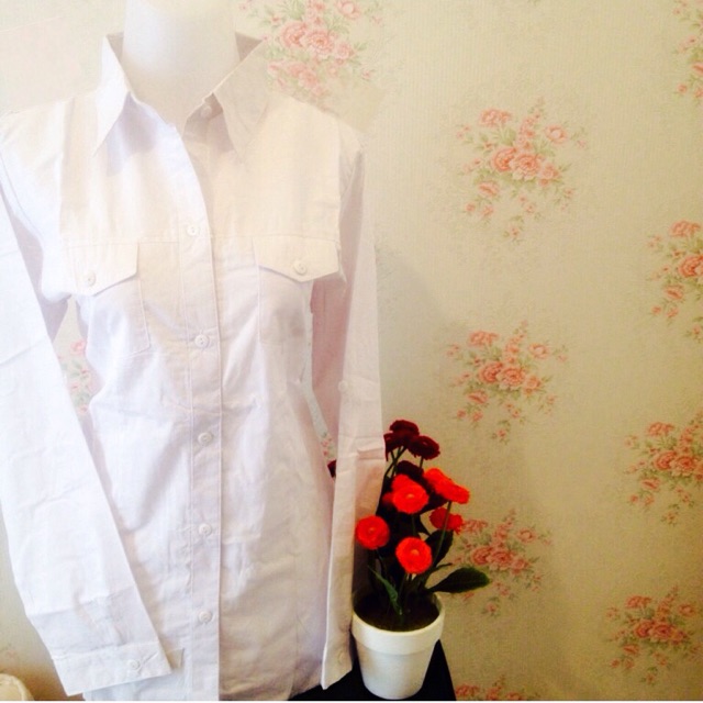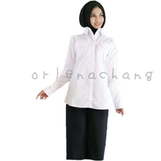 Kemeja putih wanita kantor kantong / saku 2 polos katun