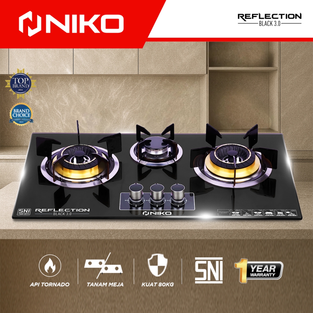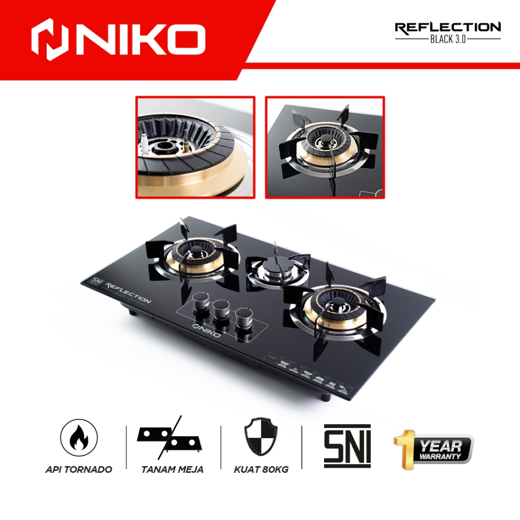 Kompor Gas 3 Tungku Kaca - Niko Reflection Black 3.0 l GARANSI RESMI