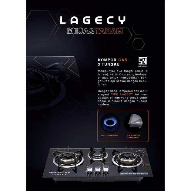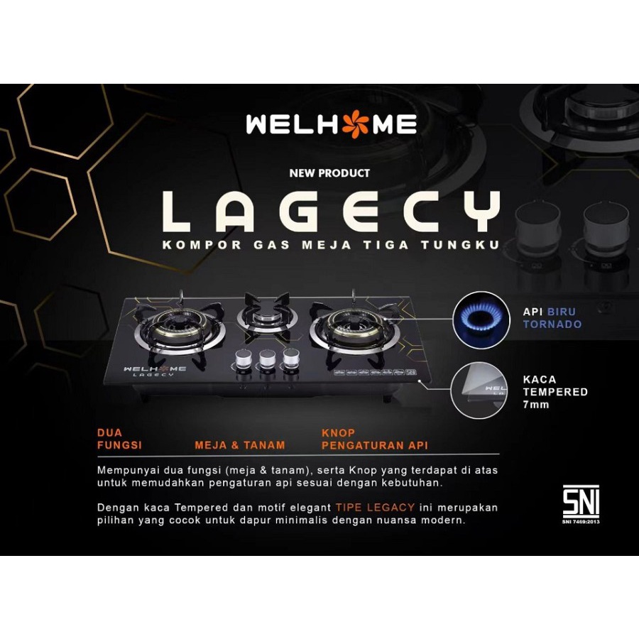 Kompor Gas Kaca 3 Tungku WELHOME Kompor Gas Kaca Tanam Kompor Tanam Tempered Glass Kompor Kaca Model Minimalis Super Elegant