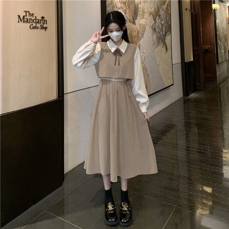Korean Fake Two-piece Long Sleeve Dress French Retro2025