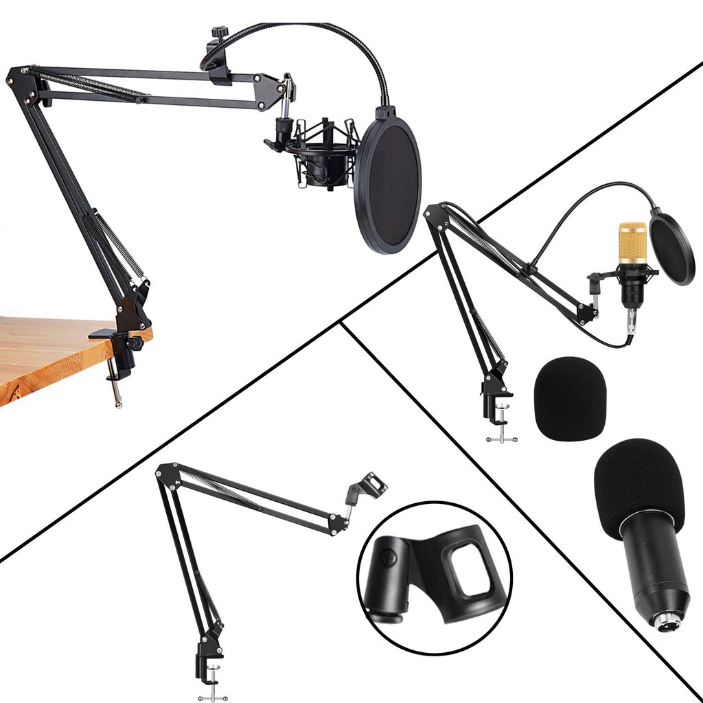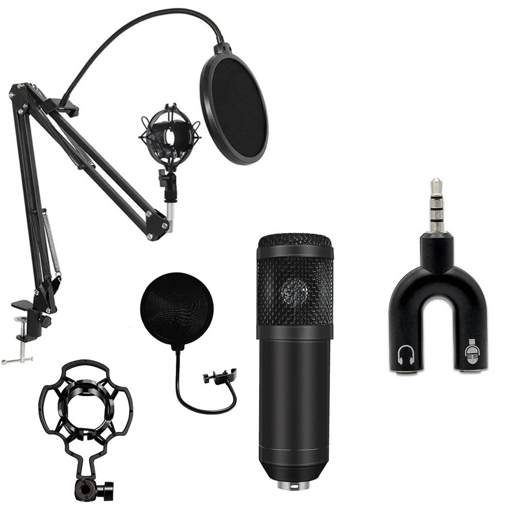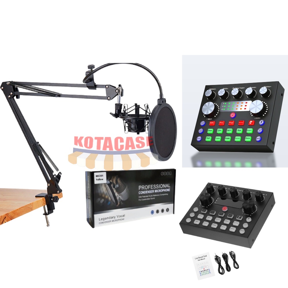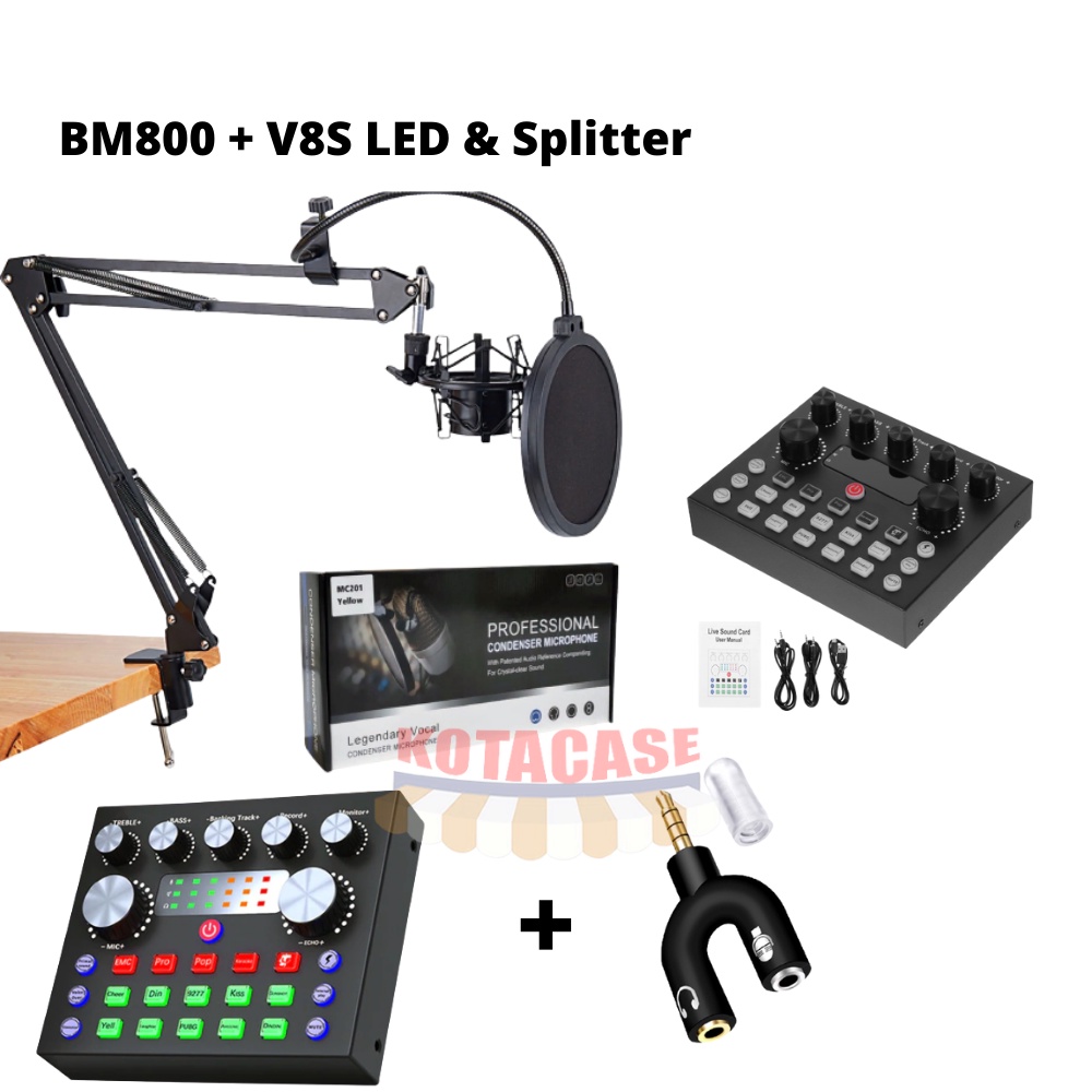 Mikrofon Condenser BM800 Full Set Paket Recording Condenser Adjustable Desktop Stand + V8 SOUNDCARD Adapter Audio Sound Adapter Audio Jack Mic Berdiri Mikropon Rekaman