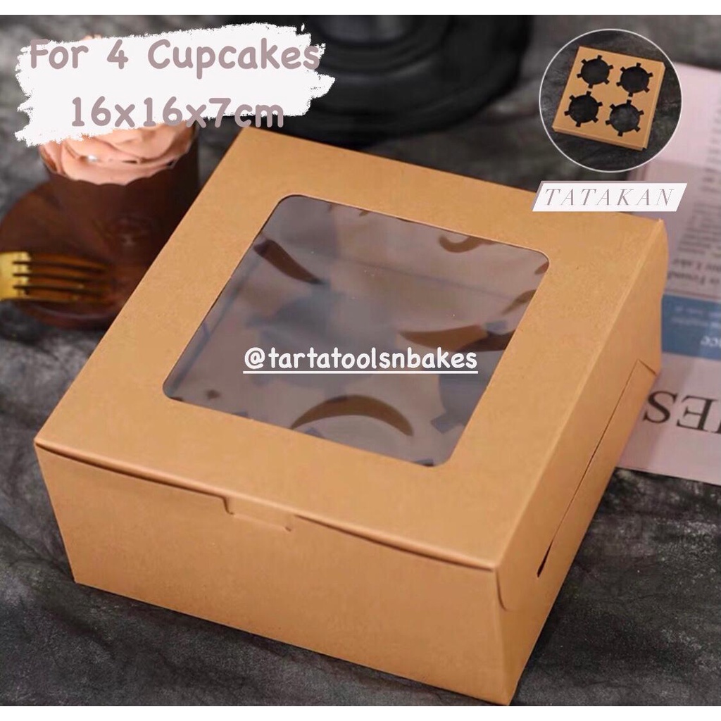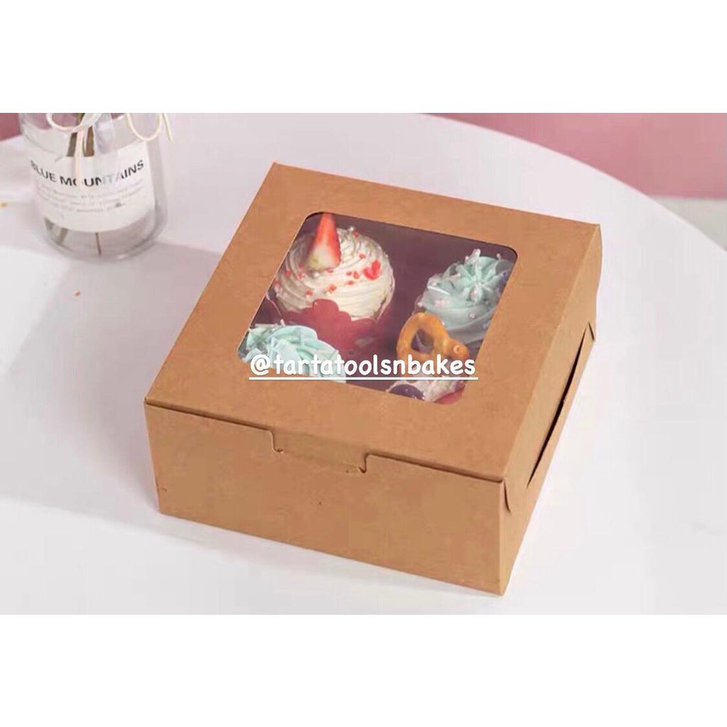(10PCS) Kotak Kue Cupcake Segi Coklat Jendela Mika16x16x7,5CM (for 4 cupcake bulat)