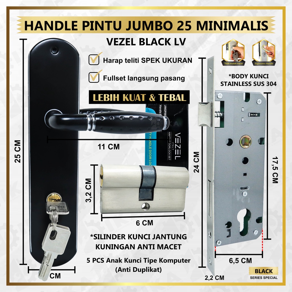 Gagang Pintu Size BESAR 25cm + Body Handle Pintu Ukuran BESAR 25cm Saja dengan Body kunci komplit mesin pintu silinder kunci komplit anti duplikat anti karat luntur warna tarikan dorongan ongklek