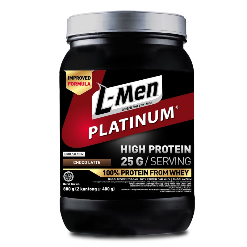 L-Men Platinum Choco Latte 800gram (25 g protein/serving) -1,7 lbs- Suplemen Tinggi Whey Protein Rendah Lemak
