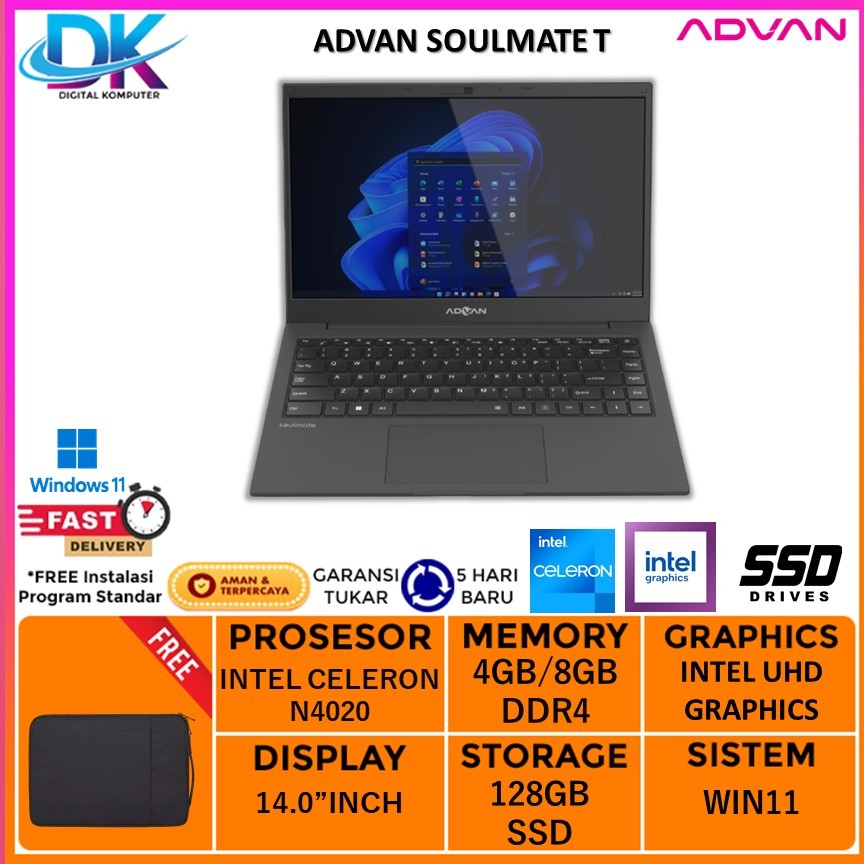 Laptop Murah Advan Soulmate T | INTEL N4020 | 4GB/8GB 128GB | Win 11 14.0" - NON BUNDLE, 4GB - 128GB