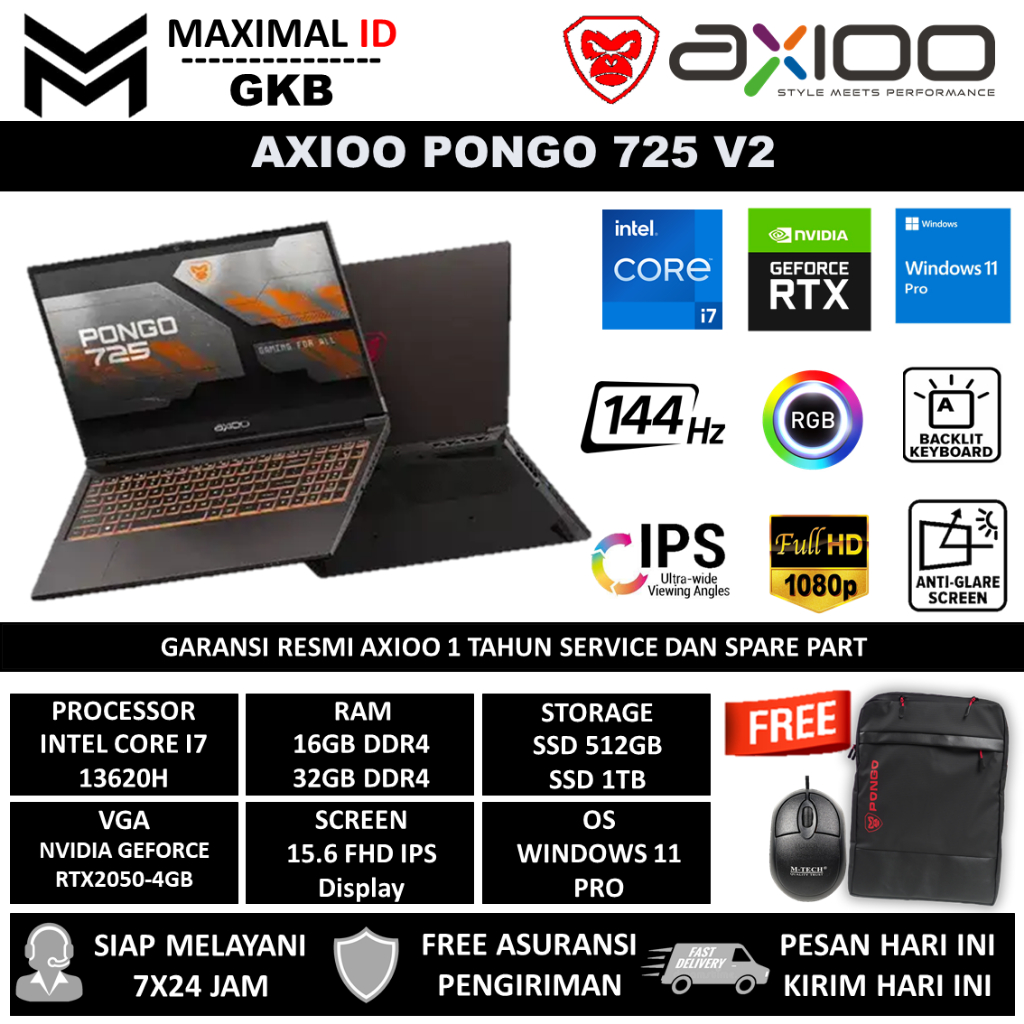 Laptop Axioo Pongo 725 V2 Intel Core I7 13620H 32GB 1TB RTX2050-4GB 15.6 FHD IPS BL RGB Win11Pro