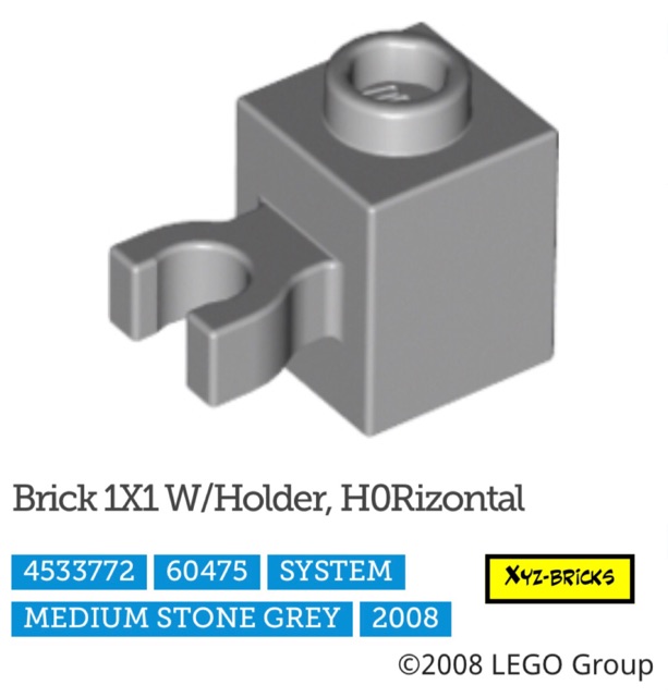 LEGO PARTS 4533772 - Brick 1x1 with Horizontal Holder Medium Stone Grey (LBG)