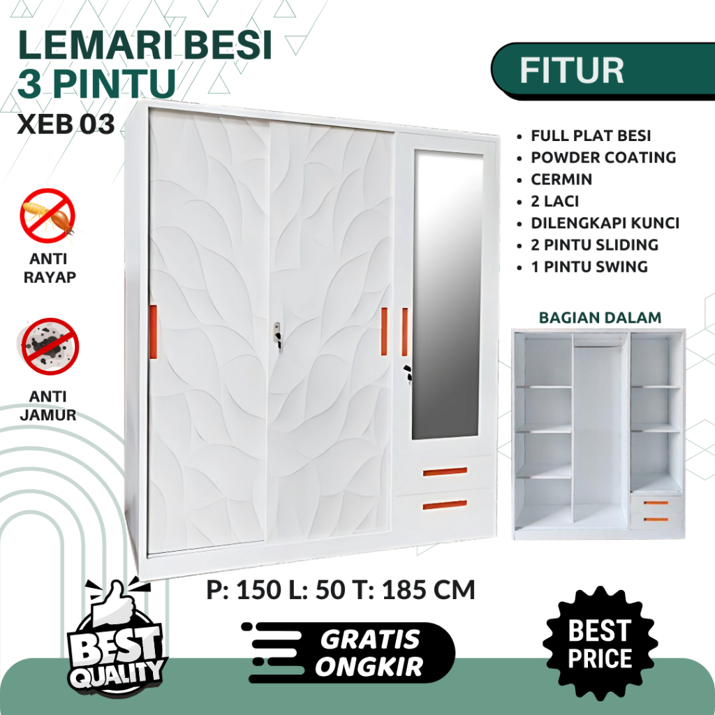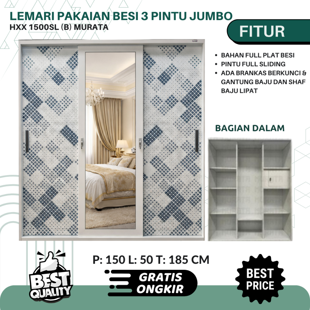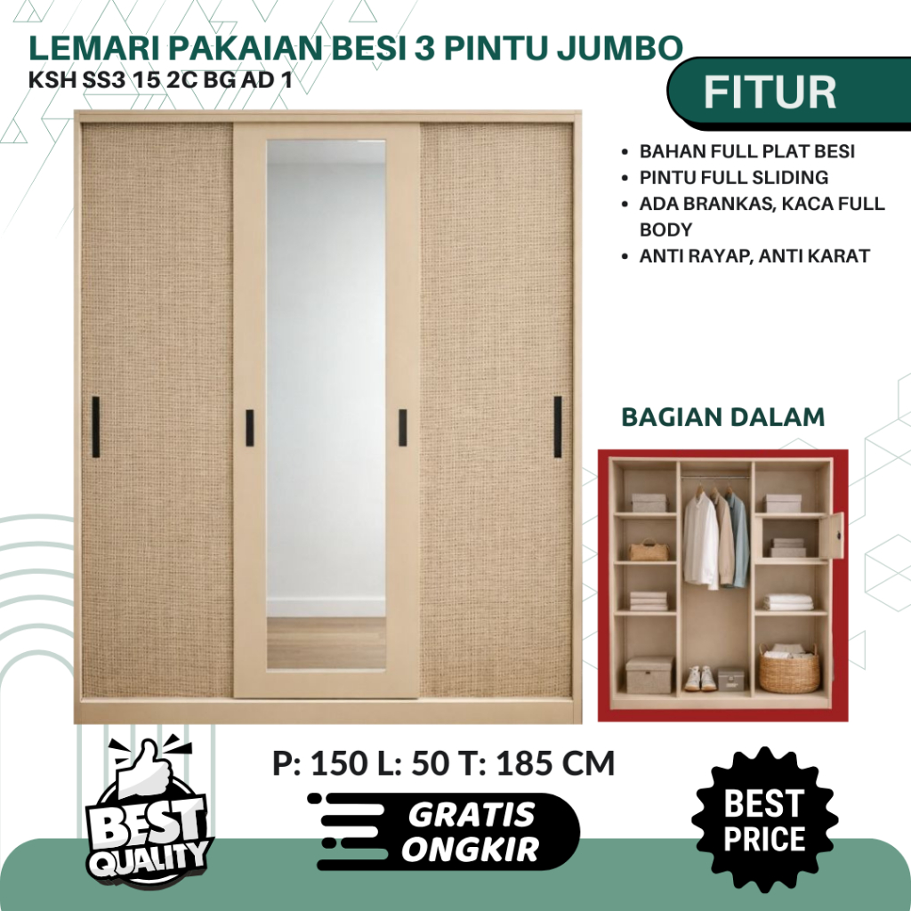 Lemari Pakaian Besi 3 Pintu - Lemari Besi 3 Pintu Jumbo 150 Sliding, Lemari Pintu Geser Anti Rayap