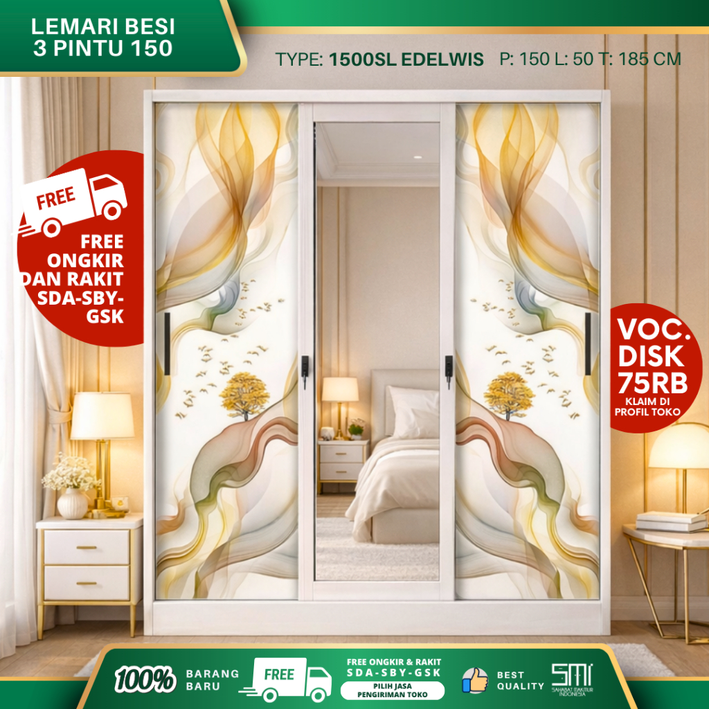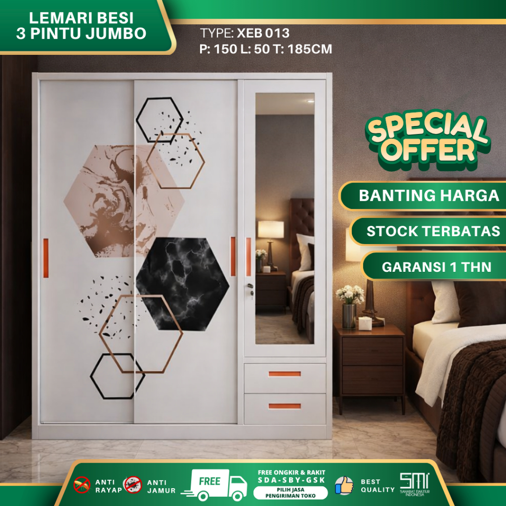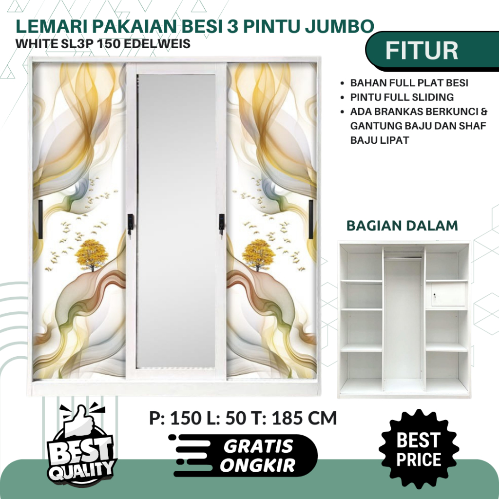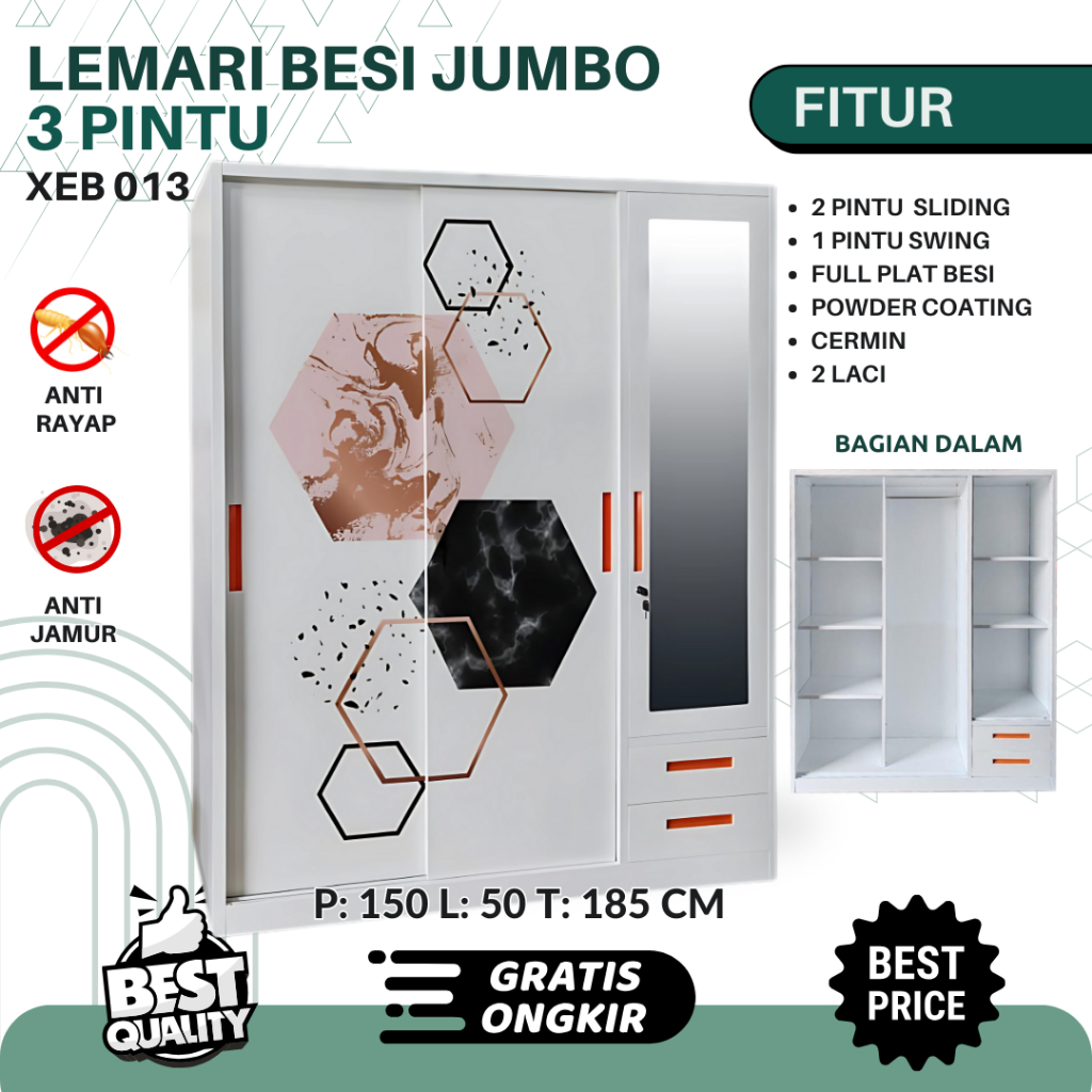 Lemari Pakaian Besi 3 Pintu - Lemari Besi 3 Pintu Jumbo 150 Sliding, Lemari Pintu Geser Anti Rayap