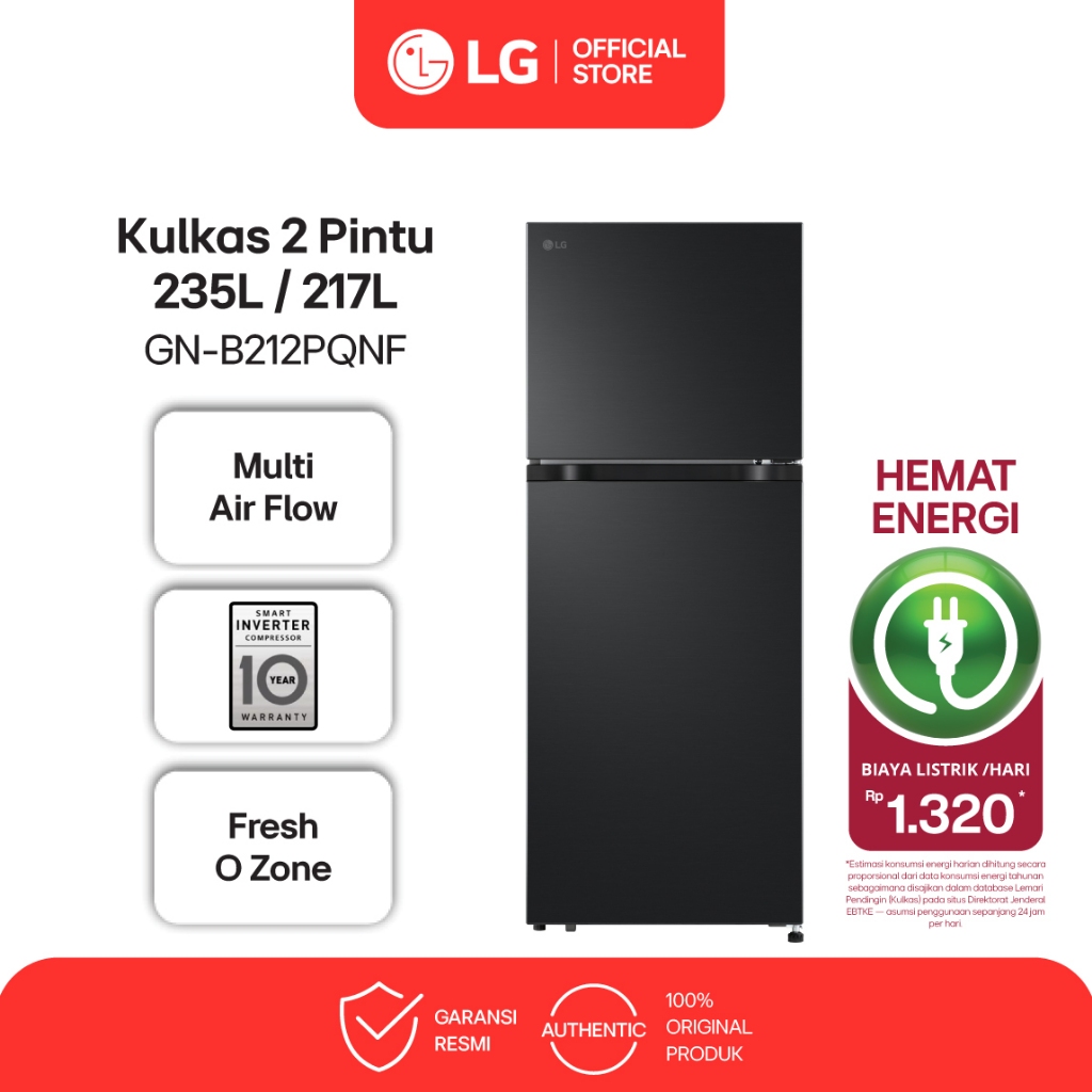 LG Kulkas 2 Pintu 235L / 217L - Multi Air Flow - Fresh O Zone - Inverter Essence Matte Black - Model GN-B212PQNF