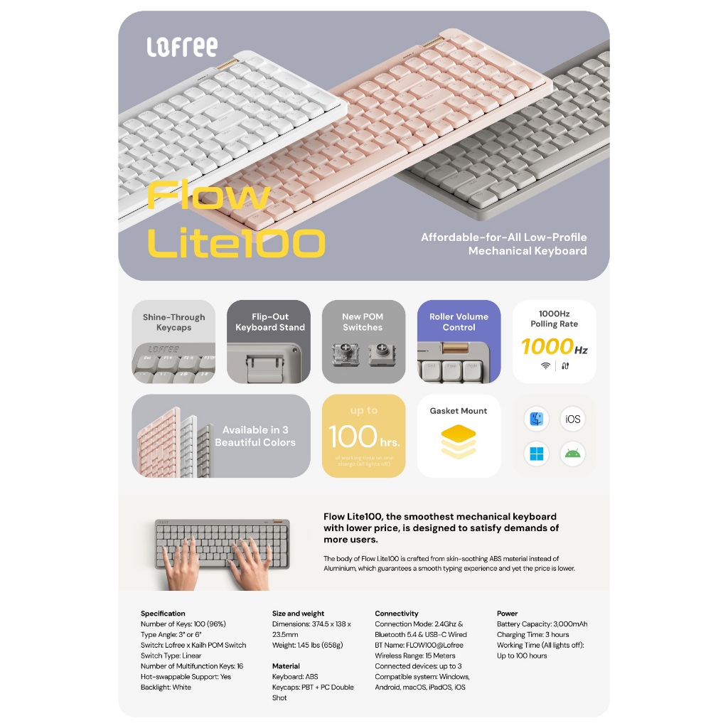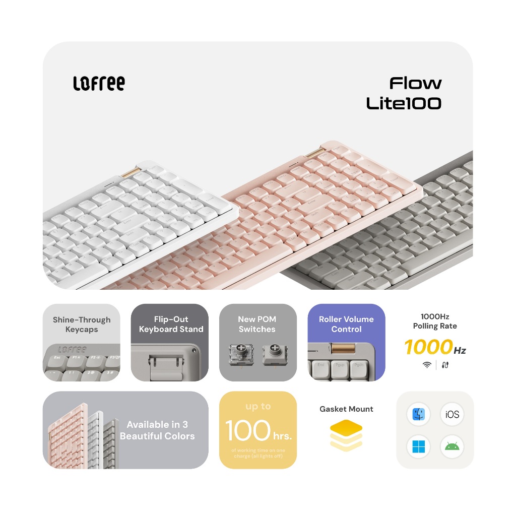 Keyboard Wireless LOFREE Flow Lite100 Low Profile 96% Layout Wireless Mechanical Keyboard Shine Through Keycaps with Numpad support MacOS Windows Linux cocok untuk iPad MacBook