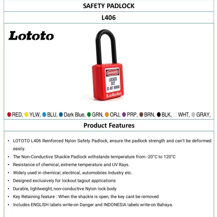 LOTOTO L406 Gembok Safety Loto Padlock Safety LockOut TagOut - Hitam