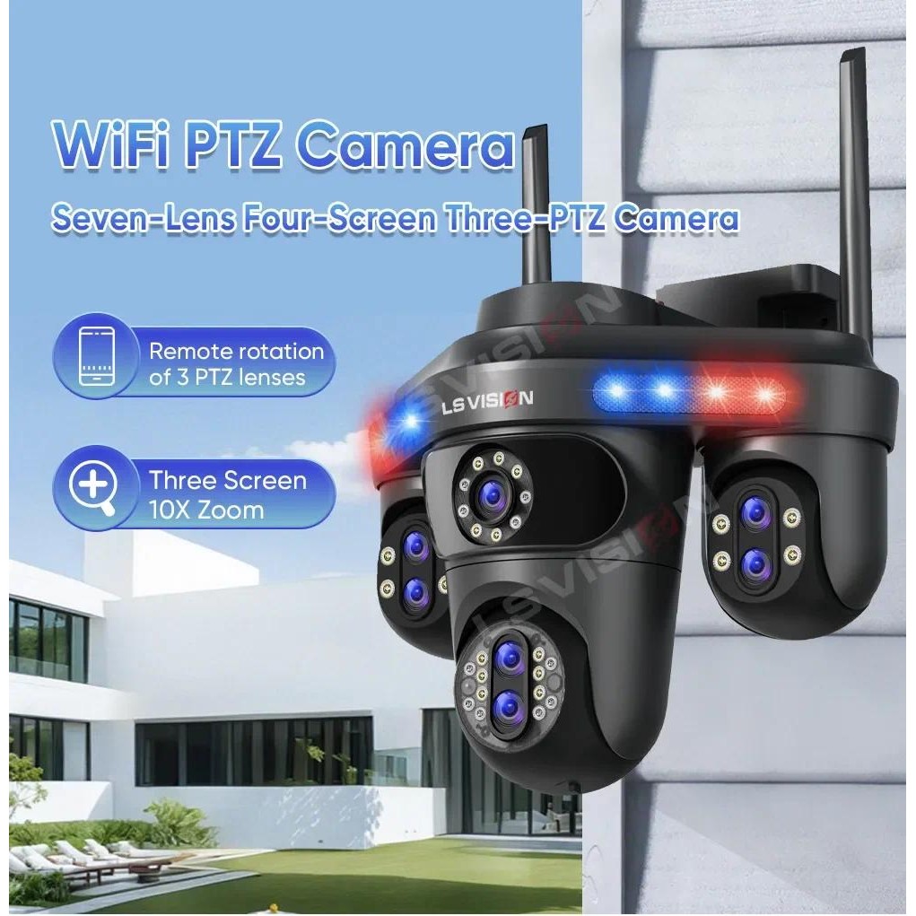 LS VISION 35MP Four Screens WiFi Security Camera Outdoor Seven Lens Three PTZ 10X Optical Zoom Cameras Auto Tracking CCTV Camera