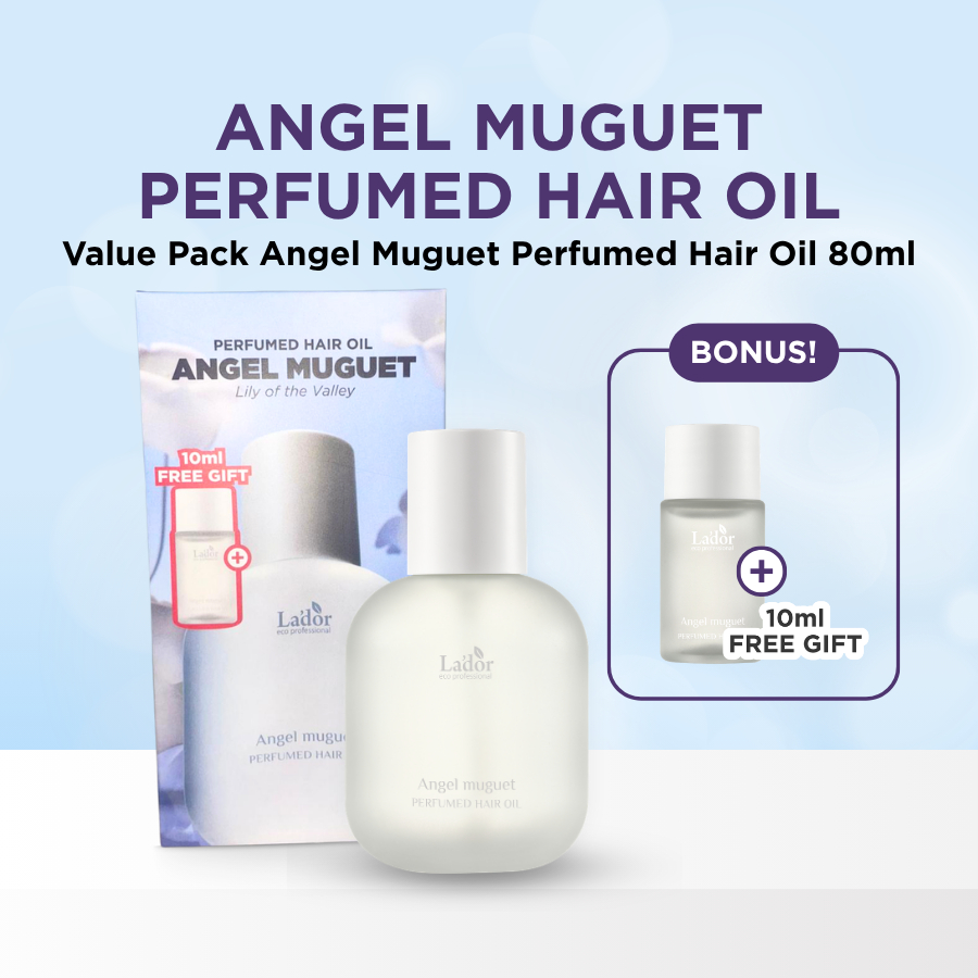 Lador Perfumed Hair Oil Angel Muguet 80mL + Perfumed Hair Oil Angel Muguet 10mL | Heat Protection | Tekstur Oil | Aroma Lily | Rambut Normal | Rambut Catok