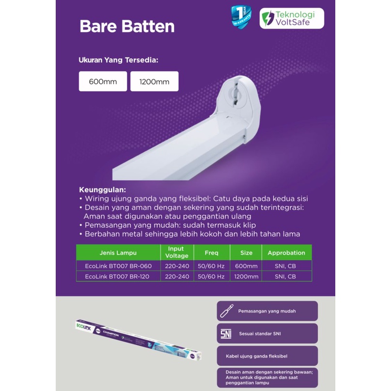 Lampu TL LED SET T8 16 Watt 16Watt 16W 16 W + BARE BATTEN HOUSING RUMAH LAMPU 1200mm ECOLINK Garansi 1 Tahun