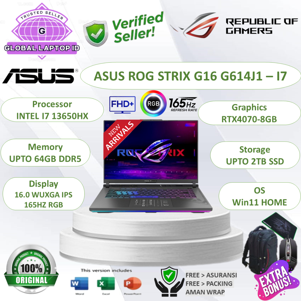 Laptop Gaming ASUS ROG STRIX G16 G614J1 Intel i7 13650HX RTX4070 RAM 64GB DDR5 2TB SSD WUXGA IPS 165HZ RGB Windows 11 Original