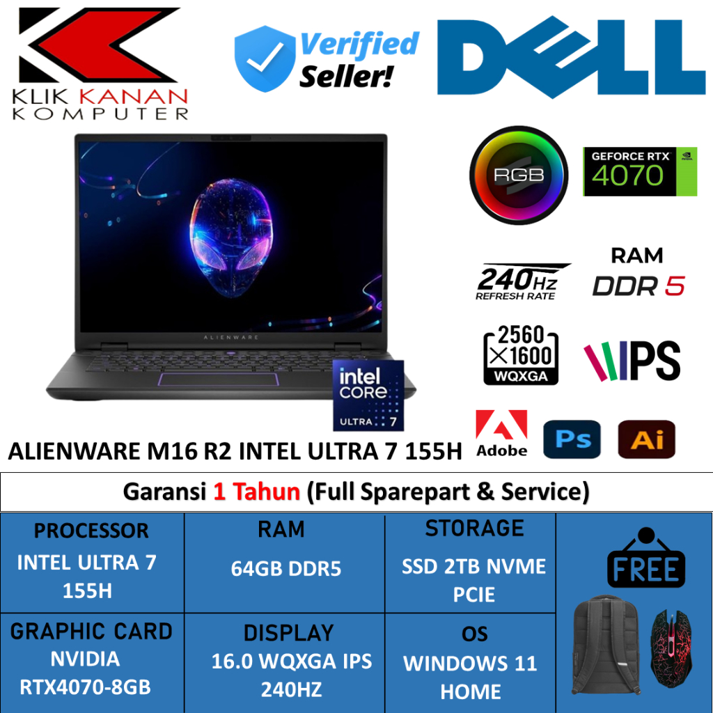Laptop Gaming Alienware M16 Intel Ultra 7 155H 16Gb Ddr5 1Tb RTX4070 16.0 Wqxga Ips 240HZ Rgb Win11