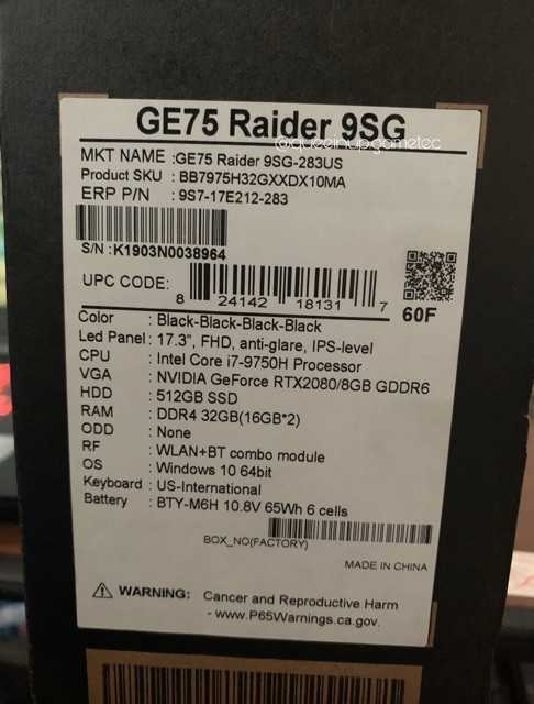 Laptop Gaming MSI GE75 9SG RTX 2080 i7 9750H