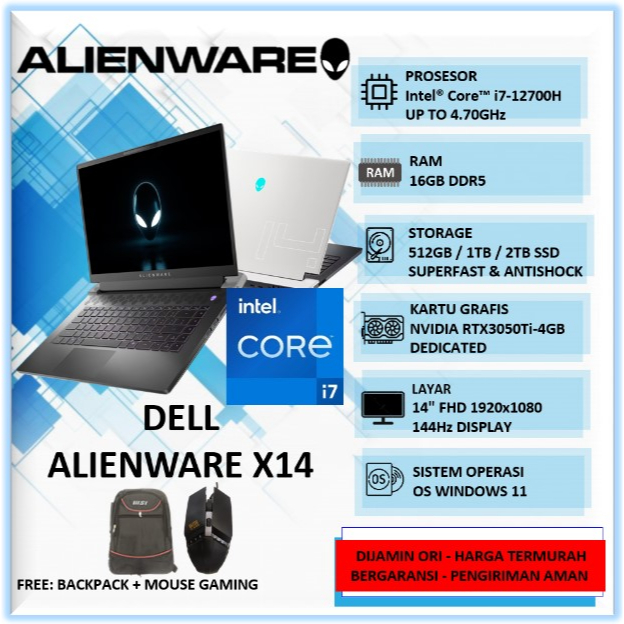 Laptop Gaming Murah Mulus Dell Alienware X14 Intel Core i7 Gen 12 Ram 16GB SSD 2TB RTX3050Ti 4GB 14" Windows 11 Home