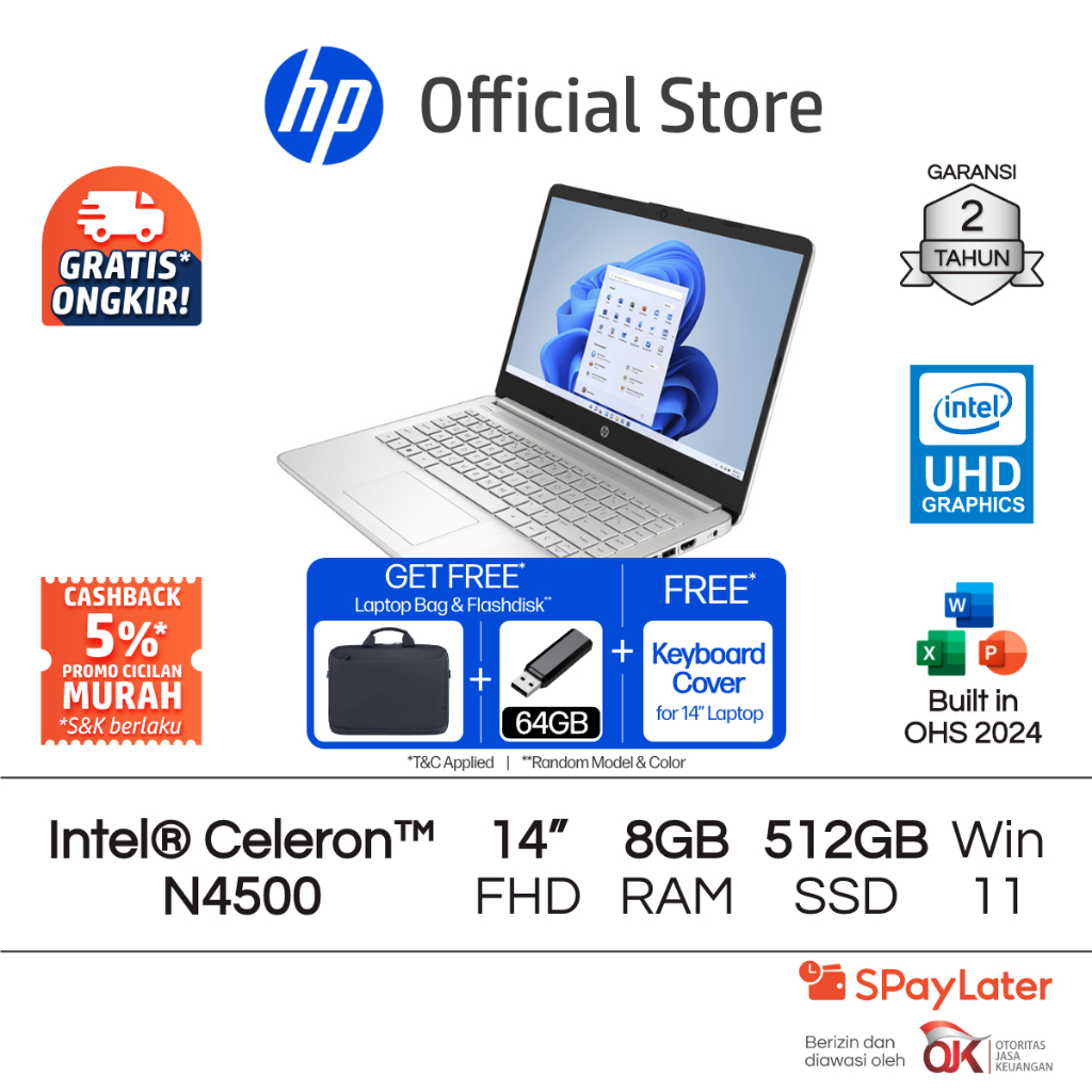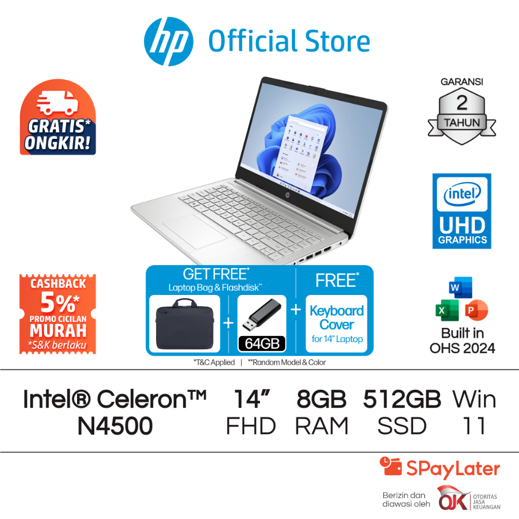 Laptop HP Intel Celeron N4500 UHD 8GB / 4GB RAM 256GB / 512GB SSD Silver / Gold / White Windows 11 Home 14 Inch Garansi 2 Tahun Promo Murah Gratis Ongkir Official Non Second