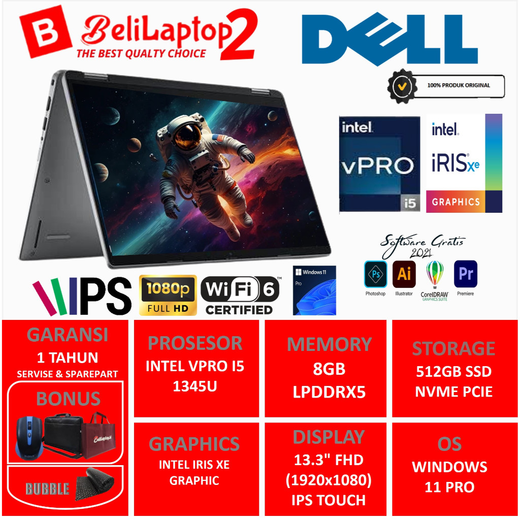 Laptop Kerja Dell Latitude 13 5340 Intel Vpro i5 1345U Ram 8GB DDR5 Ssd 1TB 13.3 FullHD IPS Touchscreen WIn 11 PRO GREY