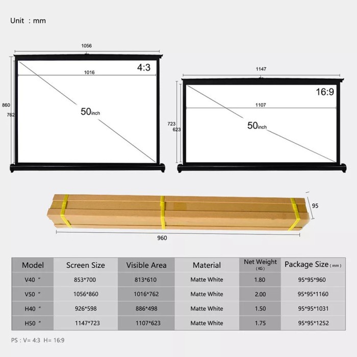 Layar Layar Proyektor Lipat 50 Inch Table Screen Projector 50" Portable