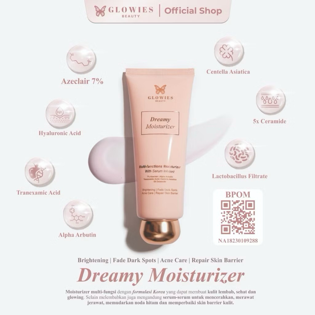 [READY] Glowies Beauty Dreamy Moisturizer 80ml Korean Formulation membantu Menghilangkan bekas jerawat PIE PIH 7% Azeclair 6% Niacinimide Alpha Arbutin 5x Ceramide Pelembab wajah Kering Memperbaiki Skin Barrier dan Acne Repair