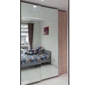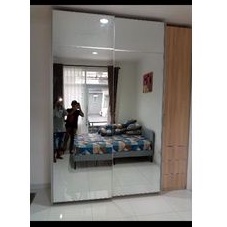 Lemari pakaian baju full plafon kayu hpl sliding rel gantung full cermin ukuran P200 x T290 kayu multiplek 18mm hpl taco